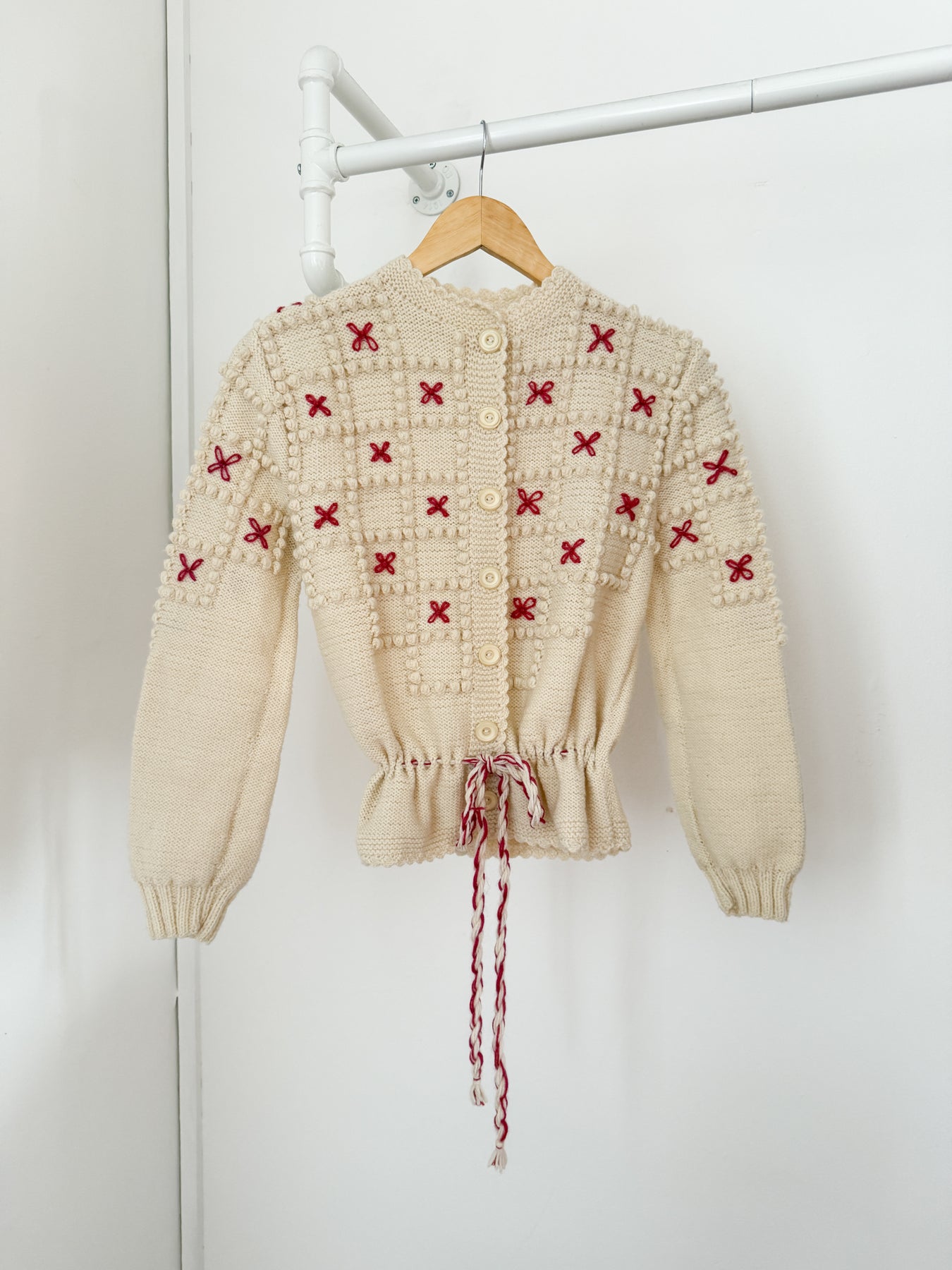This is one of the rarest and most precious Austrian knits sourced to date, made from a high quality wool yarn with amazing popcorn detailing and embroidered design. She is simply insane, and a truly special one of a kind find to cherish forever.