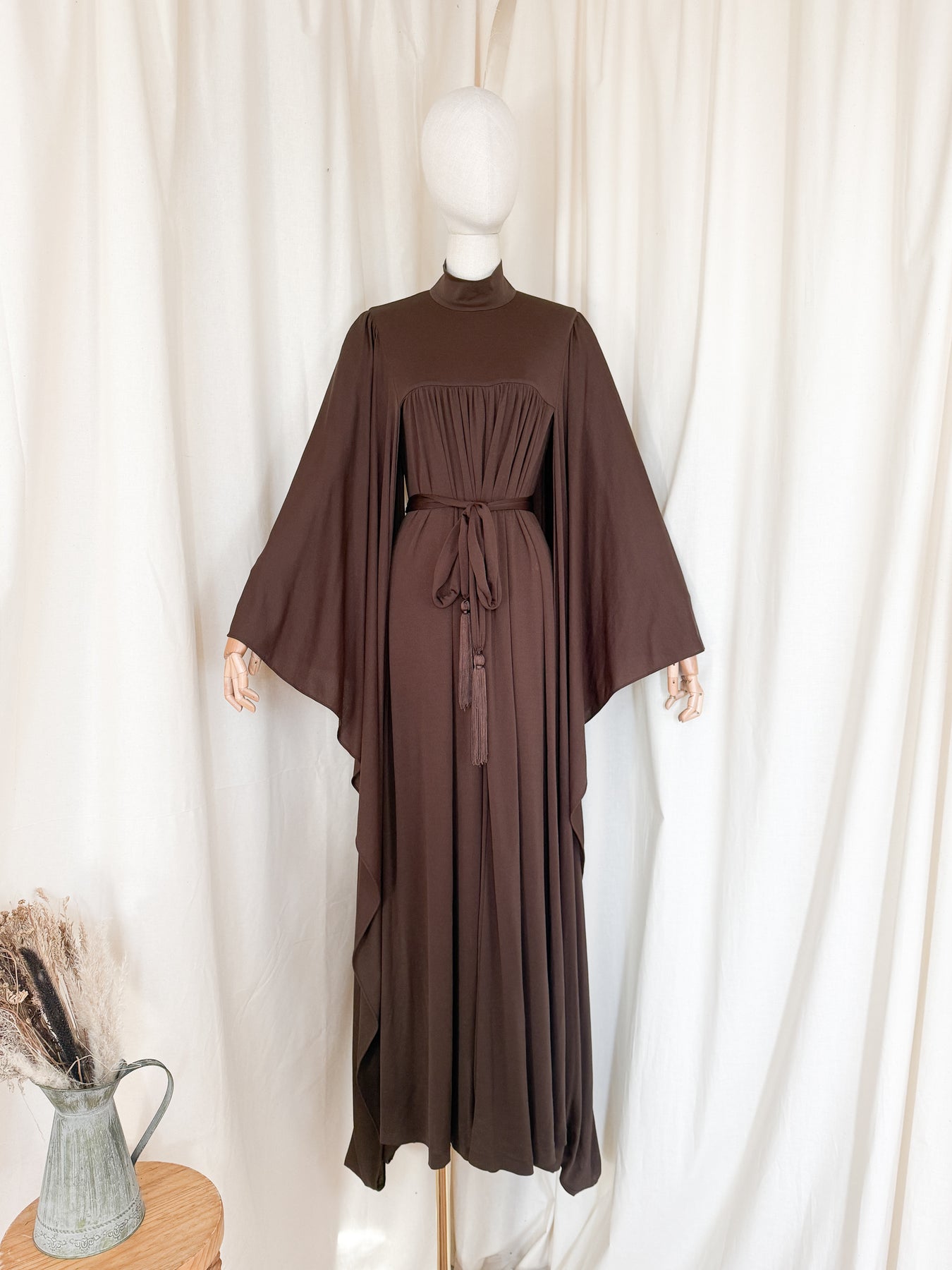 A holy grail find if there ever was one.. This precious 1970s chocolate brown kaftan dress by my all time favourite designer Gina Fratini truly is a treasure to behold. She is made from a beautiful soft slight sheen jersey fibre and has a gorgeous matching tassel belt. This dress seriously does have the worlds biggest sleeves and a beautiful flattering grecian style cut. She fully resembles the bohemian romantic elegance Fratini was known for, and is one of my most precious finds to date by this remarkable coveted British designer.