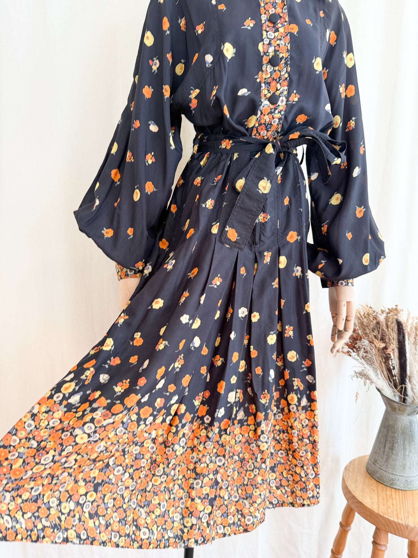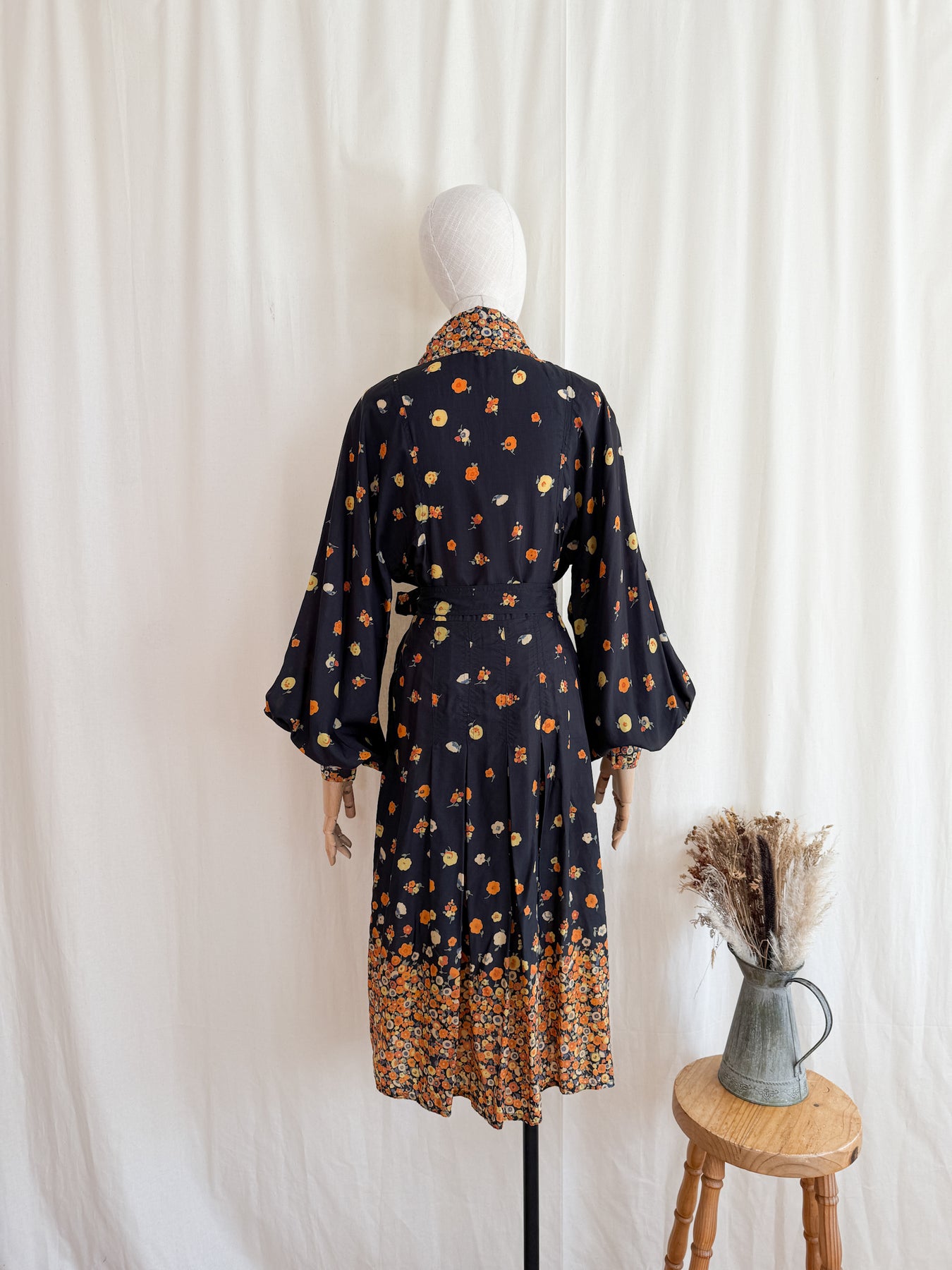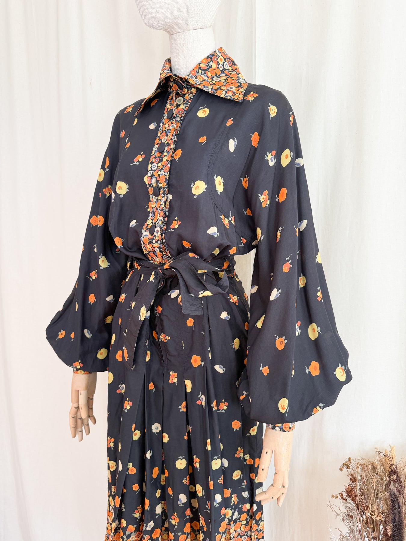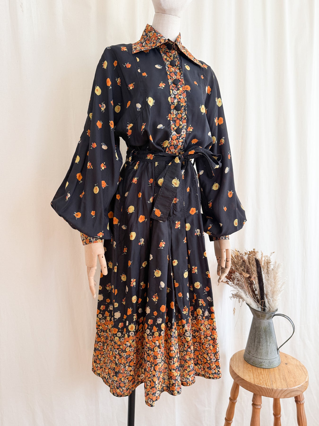 This rare collectible 1970s midi dress by Jean Varon which was the label name used by British designer John Bates, one of the most daring and innovative fashion figures of the 1960s and 70s, features a striking dagger collar and billowing sleeves that define her insane silhouette, she also comes with a matching waist tie. Crafted from a lightweight, high-end fibre typical of the era, she showcases a stunning autumnal floral print. A truly collectible piece, this dress offers timeless style perfect for elevating any wardrobe.