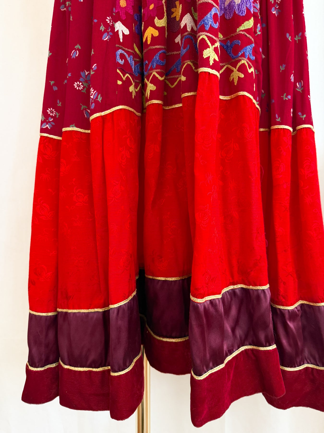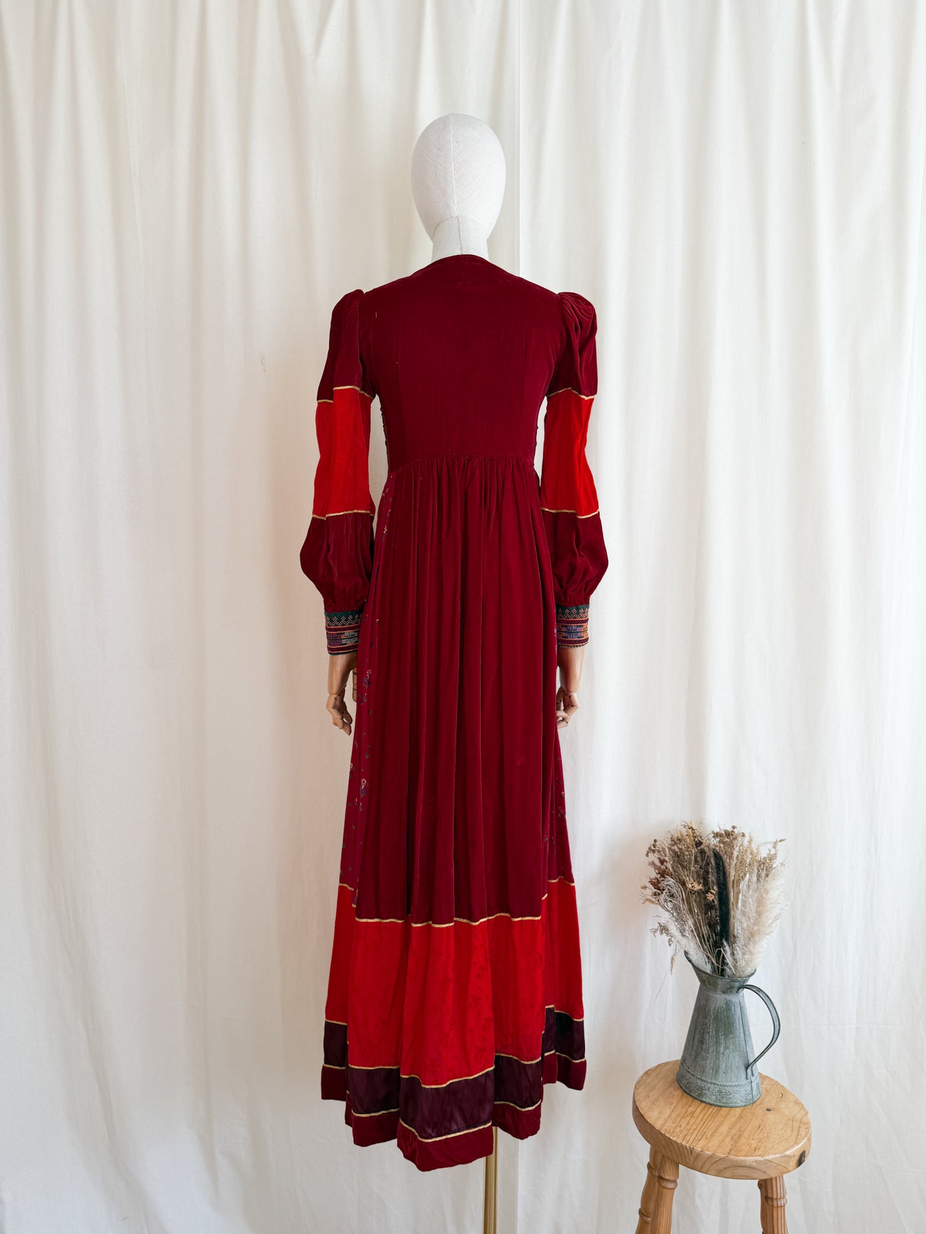 This extraordinary 1970s Afghan dress by Margaret Kimber is a once-in-a-lifetime find and is the epitome of 1970s bohemian style, likely a unique creation. Combining luxurious velvet and silk satin panels with an intricately embroidered cotton skirt, she exemplifies exquisite craftsmanship. The full, sweeping panelled skirt enhances its dramatic presence, making this holy grail piece a coveted treasure for serious collectors seeking unparalleled vintage artistry.