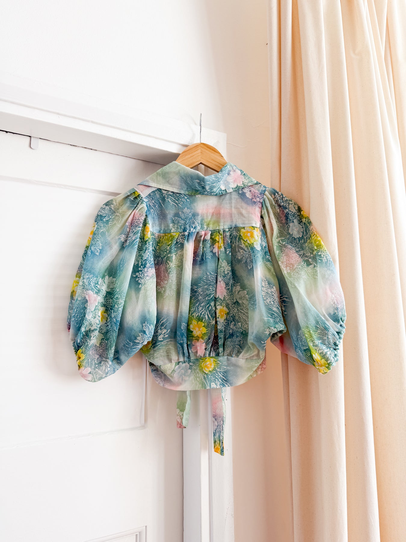 This is an INSANE 70s cotton cropped shirt with tie waist, dagger collar which can button right up and puff sleeves! She is just epic!