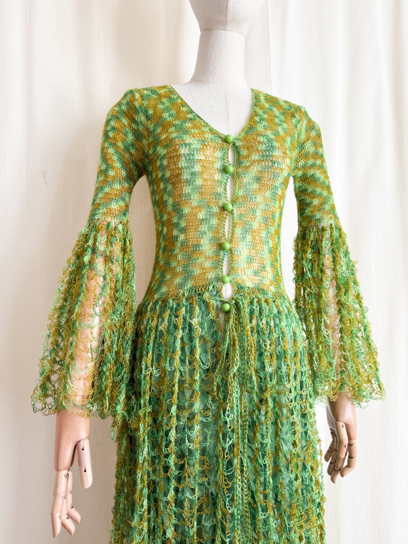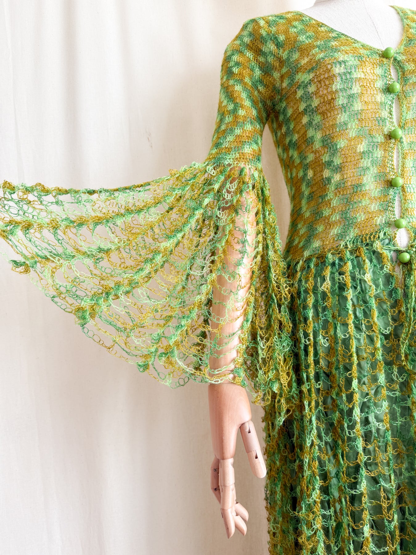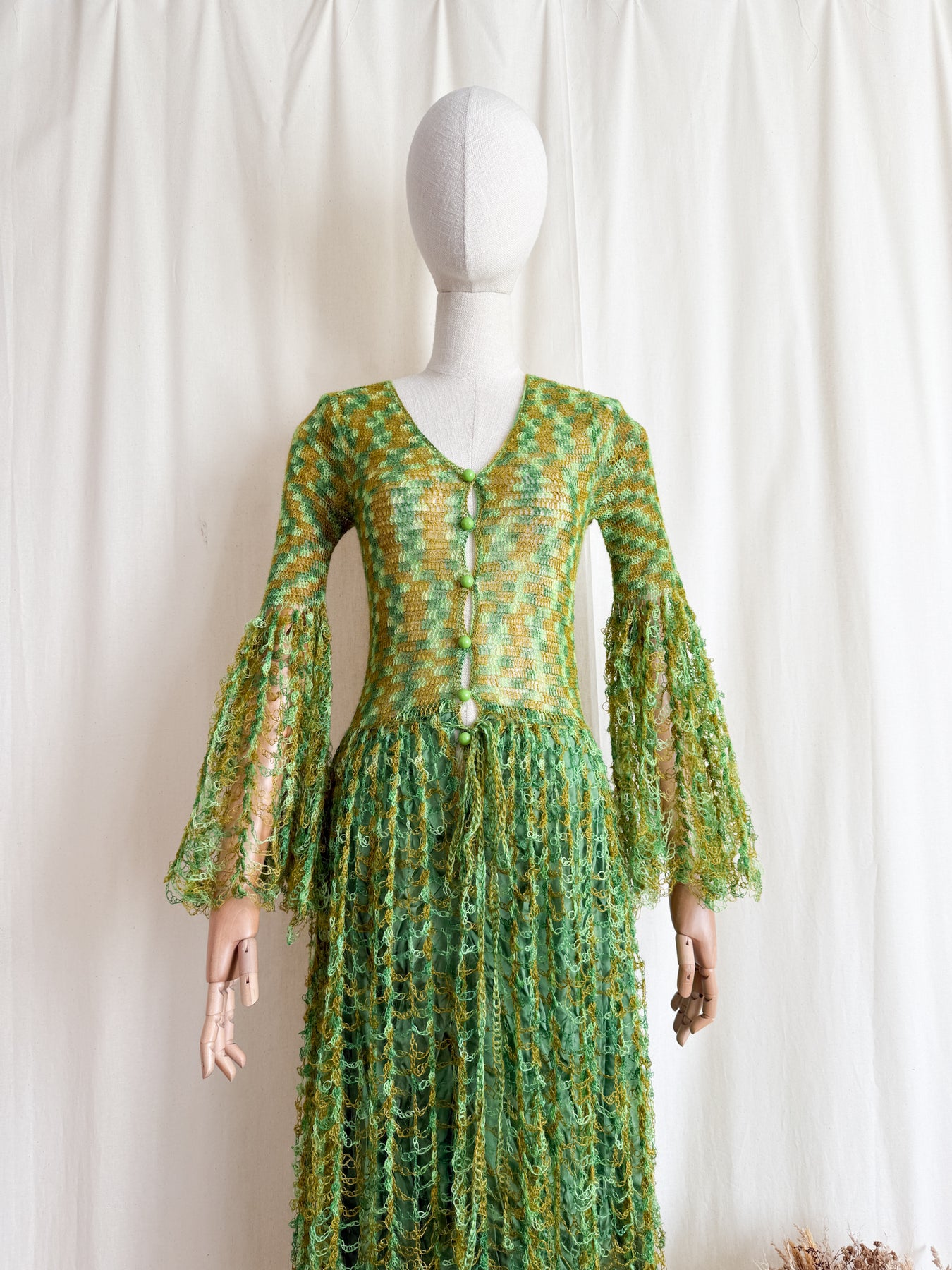 This rare one-of-a-kind 1970s loopy crochet knit maxi dress showcases a rich green palette evocative of a forest fairies wardrobe. Featuring delicate floaty sleeves with button through bodice and crafted possibly from wool, she is an exceptionally precious vintage piece. Her unique design and intricate craftsmanship make her an irreplaceable treasure, and one of the most insane things to ever grace my rails.