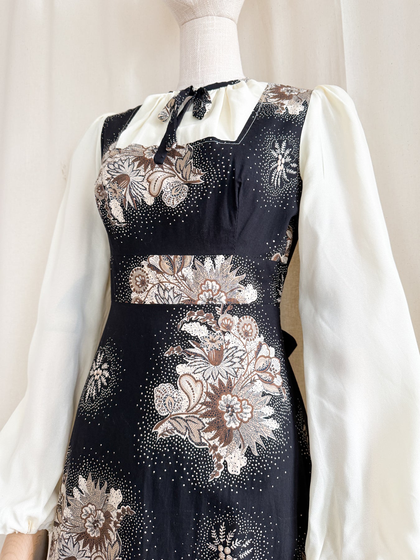 Embrace the vintage magic with this witchy 1970 rare cotton prairie maxi dress. Featuring cream chiffon sleeves that add delicate contrast, this dress showcases a striking autumnal print of brown flowers on a deep black base. Her soft cotton fabric ensures comfort, while the flowing silhouette captures the free-spirited essence of the era. Perfect for those who appreciate forever beautiful style with a mystical edge...