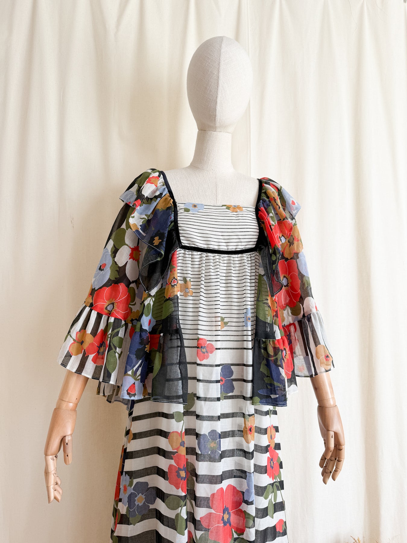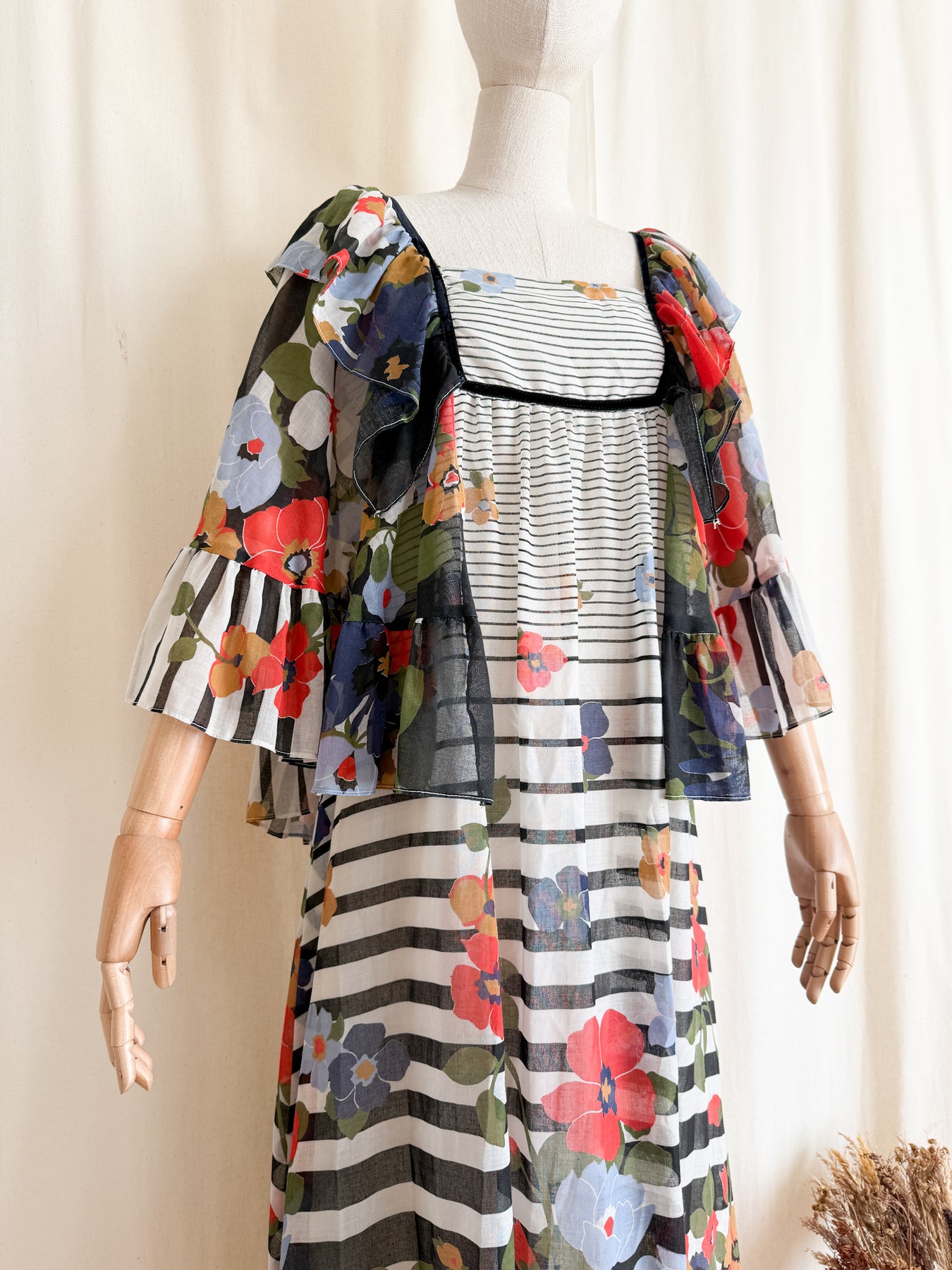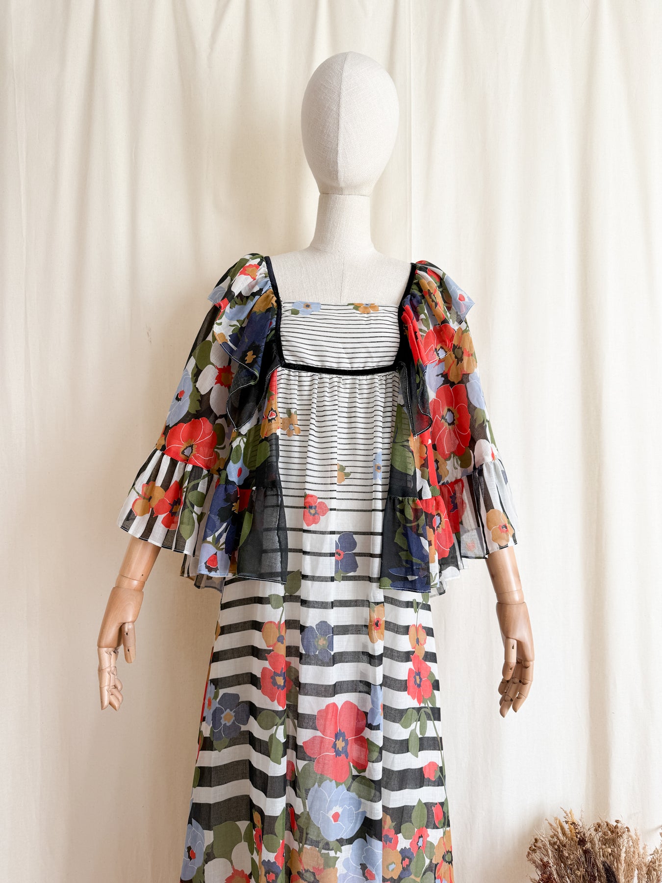 This precious holy grail 1970s cotton maxi dress by Gina Fratini for Fiona Dresses features soft, fine cotton with a purely magical silhouette. Gina Fratini will always be my favourite designer of this period, her pieces are purely magical and this dress was part of her high street collaboration with Fiona Dresses in the early 1970s. She has huge angel sleeves and gorgeous with black velvet trims, set against a striking graphic floral print with bold stripes and vibrant colors. A truly special and rare find, I hope she finds the most amazing home.