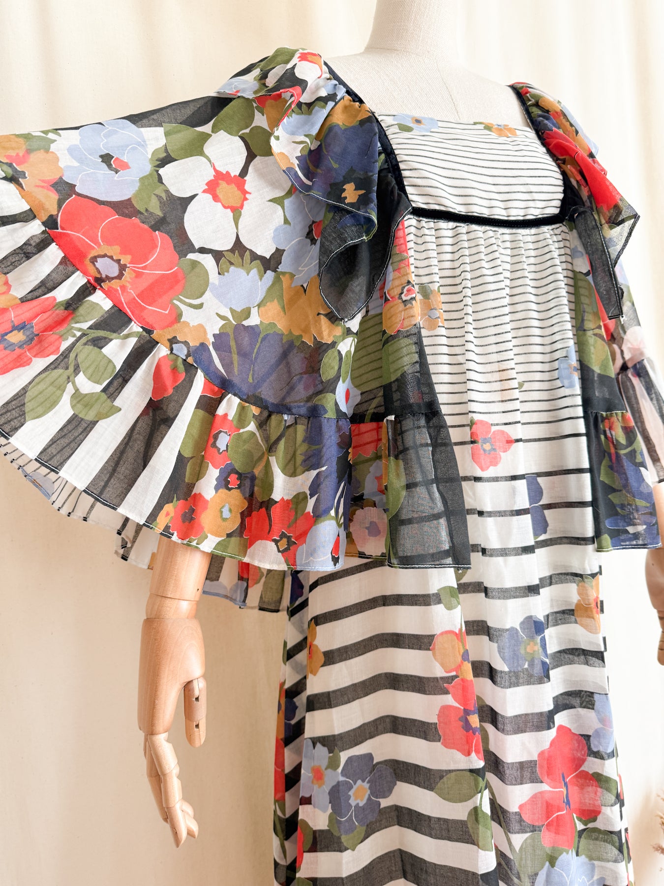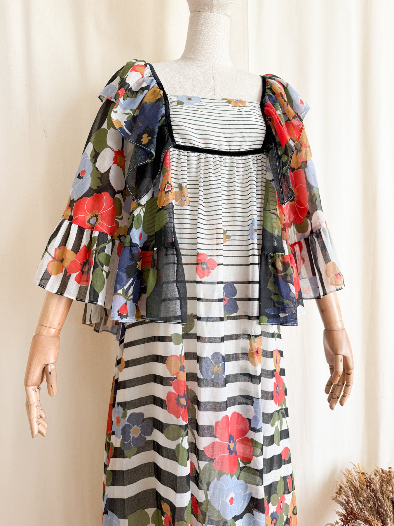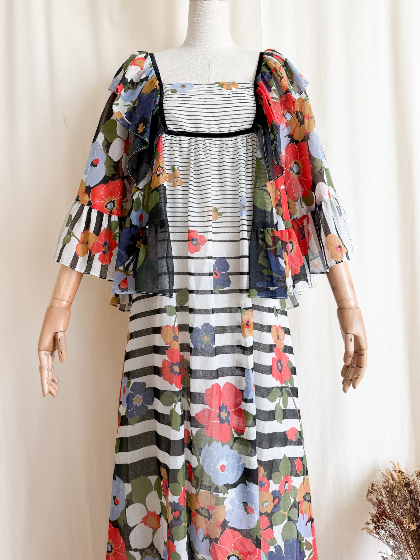 This precious holy grail 1970s cotton maxi dress by Gina Fratini for Fiona Dresses features soft, fine cotton with a purely magical silhouette. Gina Fratini will always be my favourite designer of this period, her pieces are purely magical and this dress was part of her high street collaboration with Fiona Dresses in the early 1970s. She has huge angel sleeves and gorgeous with black velvet trims, set against a striking graphic floral print with bold stripes and vibrant colors. A truly special and rare find, I hope she finds the most amazing home.