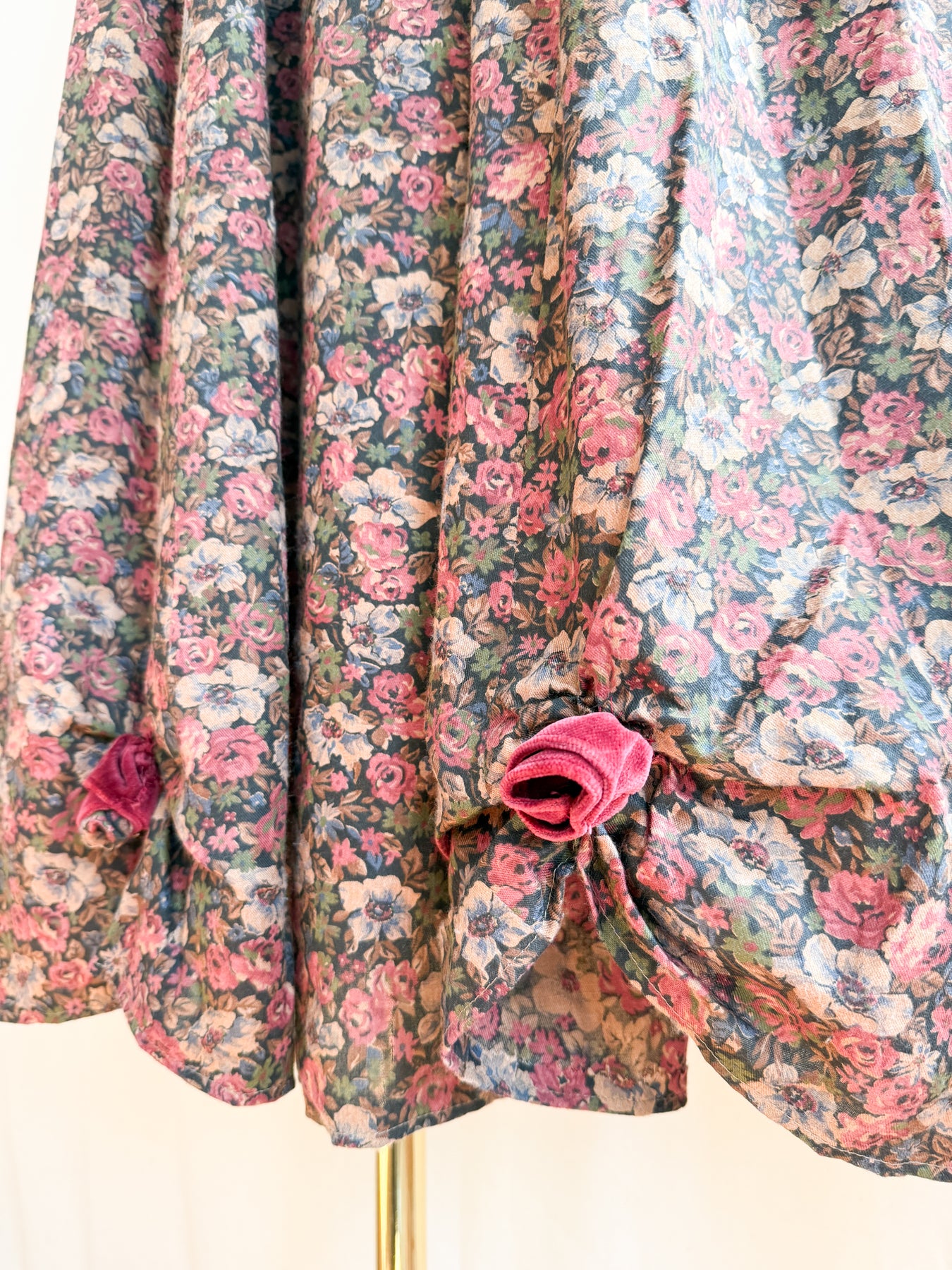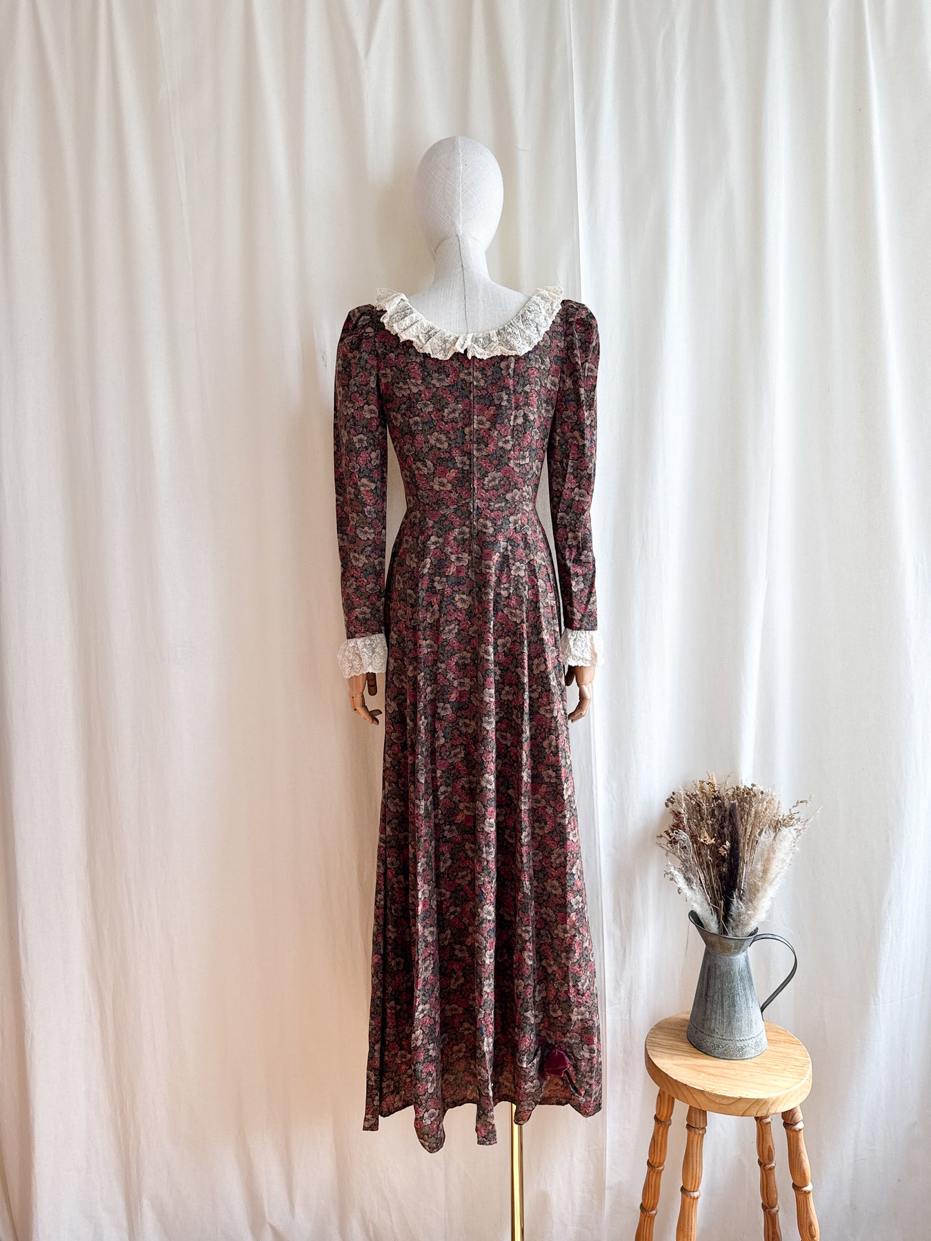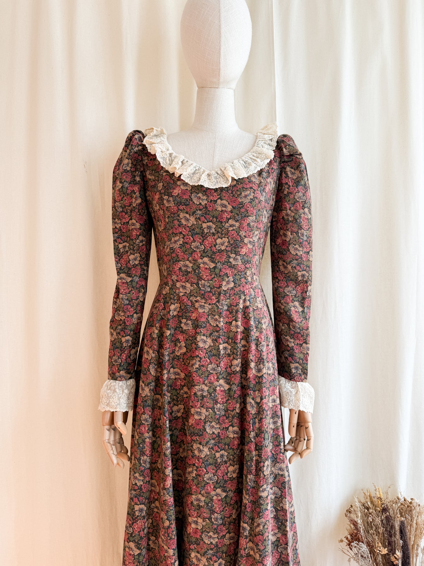 This precious rare one of a kind late 1970s cotton maxi dress showcases a soft cotton fabric in a warm autumnal palette, highlighted by a stunning deep rich floral print. Detailed with antique-style lace trims and rosette accents on the skirt, she features slim mutton sleeves that enhance her romantic, witchy silhouette. A truly one-of-a-kind timeless piece which will never be found again..