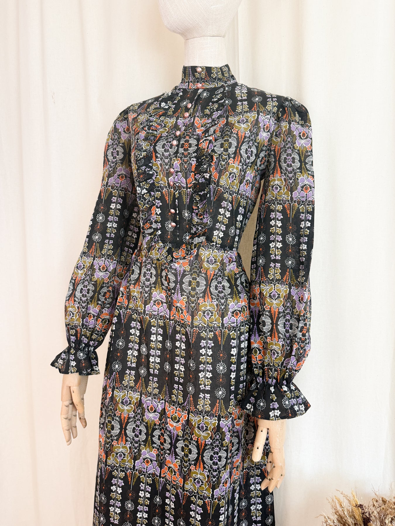This adorable 1970s cotton maxi dress features a distinctive bohemian floral print in on a gorgeous black base. Designed with a high collar and frill-cuffed sleeves, she offers a timelessly beautiful silhouette that effortlessly transitions through all seasons.