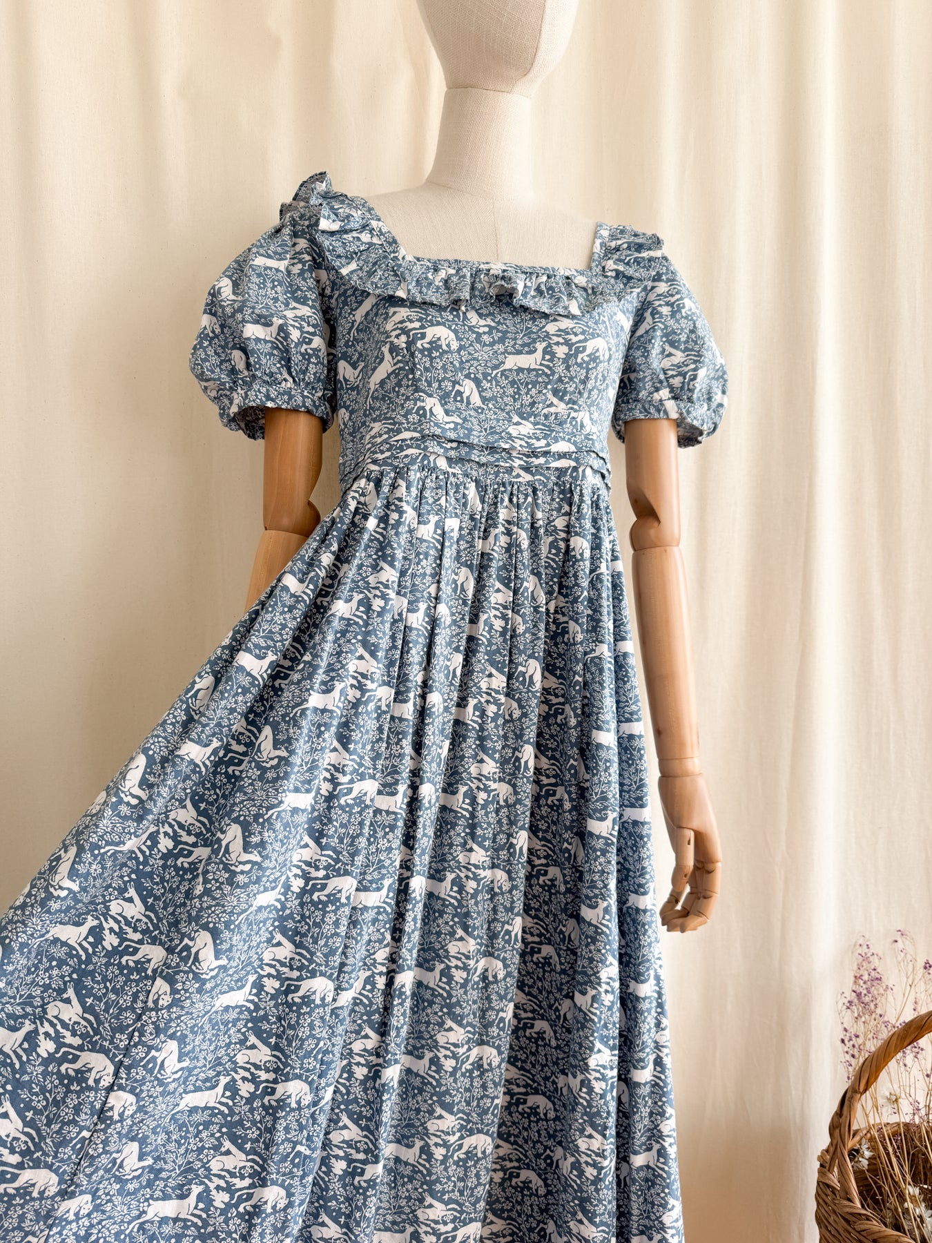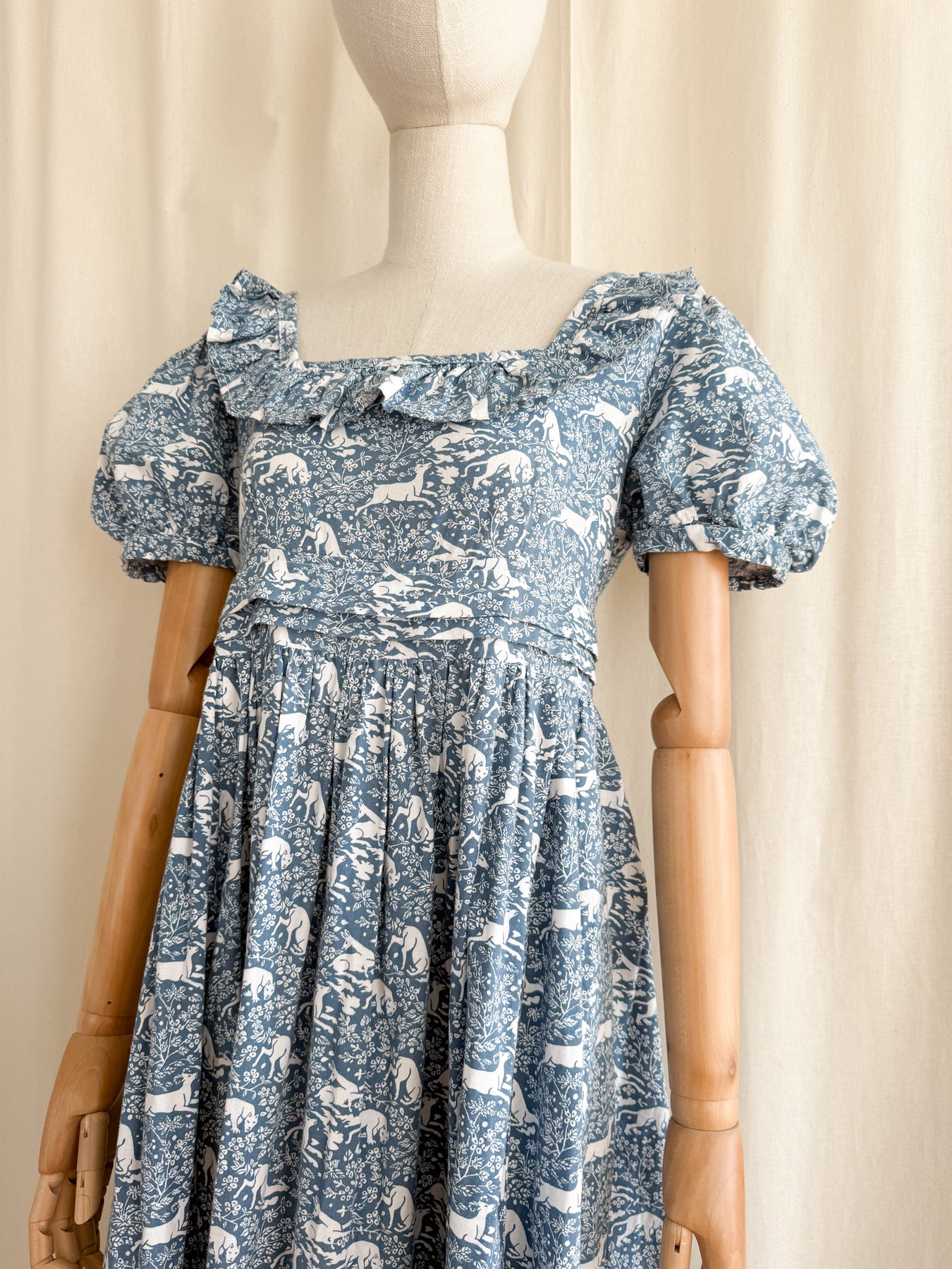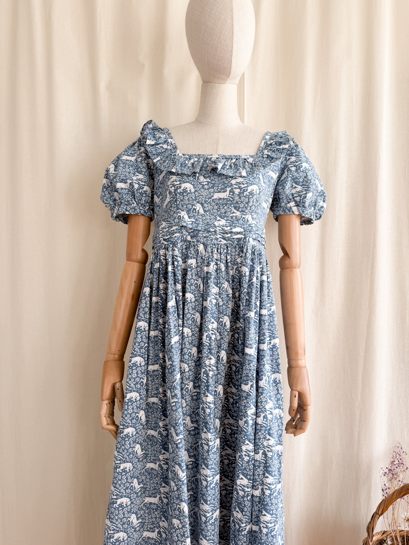 She is beautifully made from a beautiful high quality cotton with the most stunning print in a beautiful moody shade of blue. She has a square frill neckline, puff sleeves, a fitted bodice with high waist and a stunning full flowing skirt. She has incredible pleat detail to her lower skirt and waist, and when worn is one of the most flattering versatile cuts.