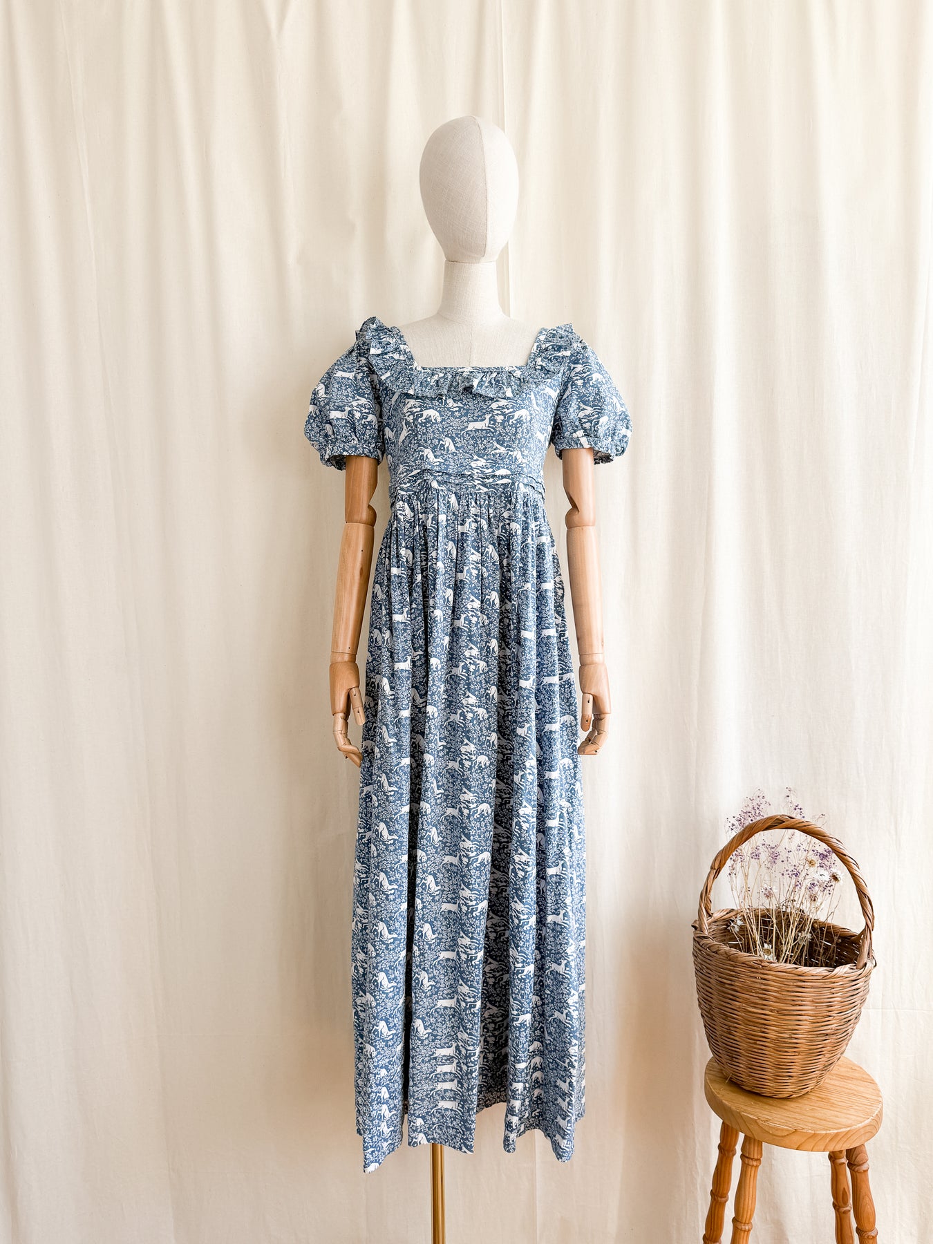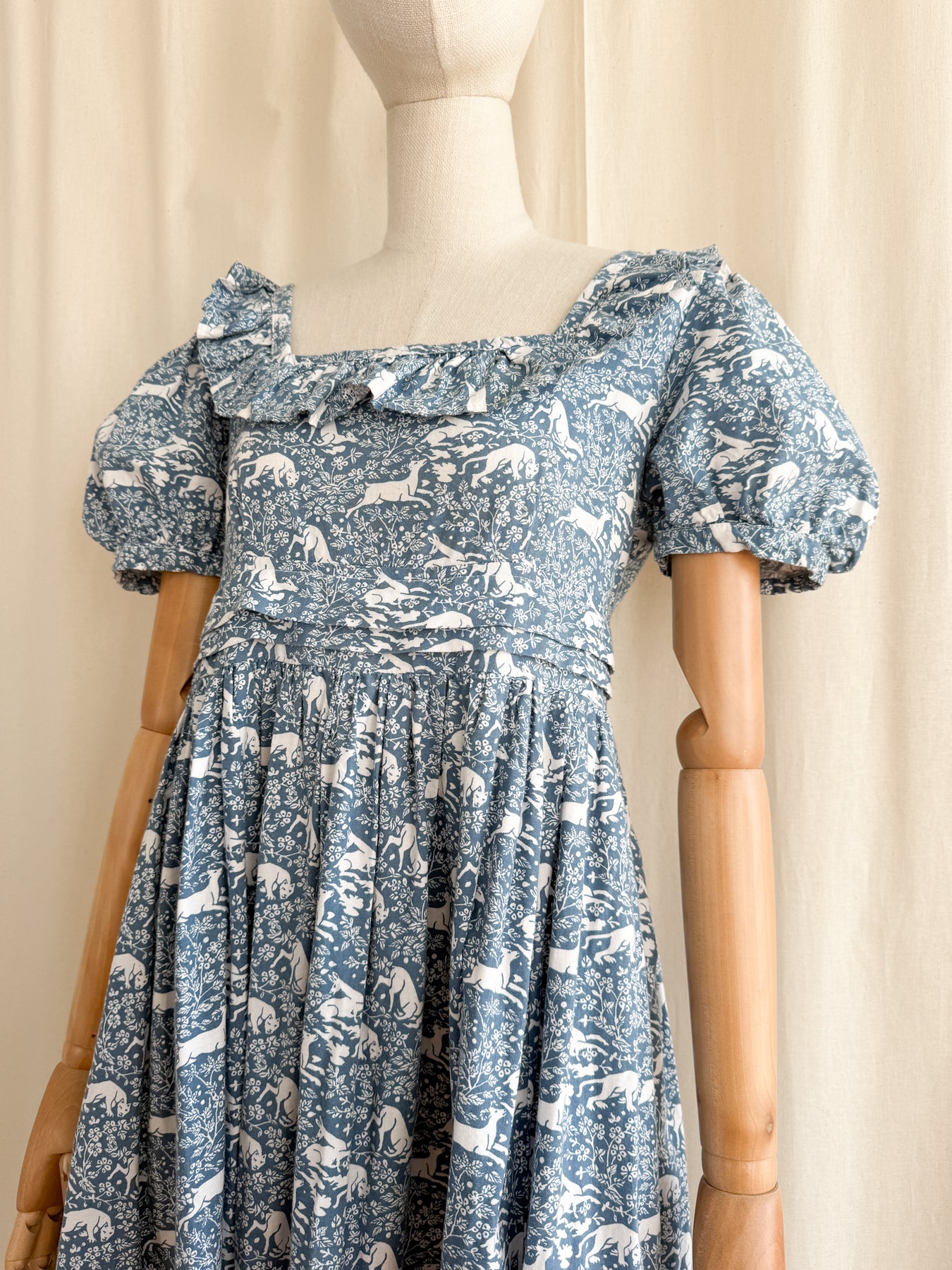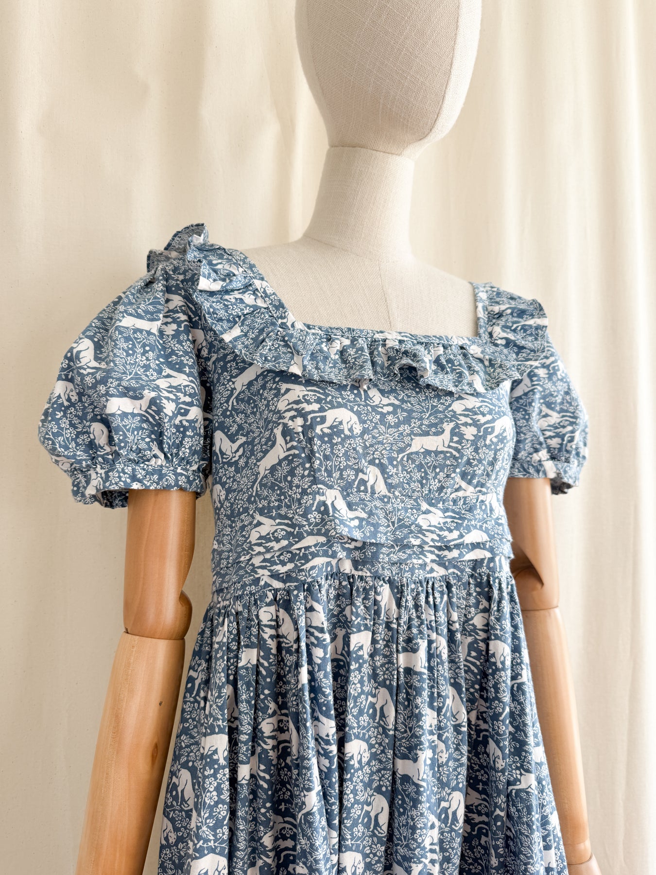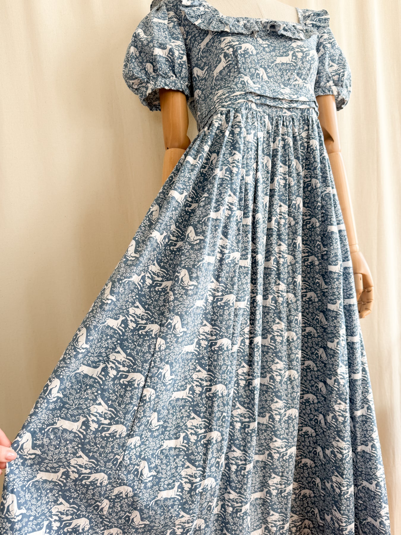 She is beautifully made from a beautiful high quality cotton with the most stunning print in a beautiful moody shade of blue. She has a square frill neckline, puff sleeves, a fitted bodice with high waist and a stunning full flowing skirt. She has incredible pleat detail to her lower skirt and waist, and when worn is one of the most flattering versatile cuts.