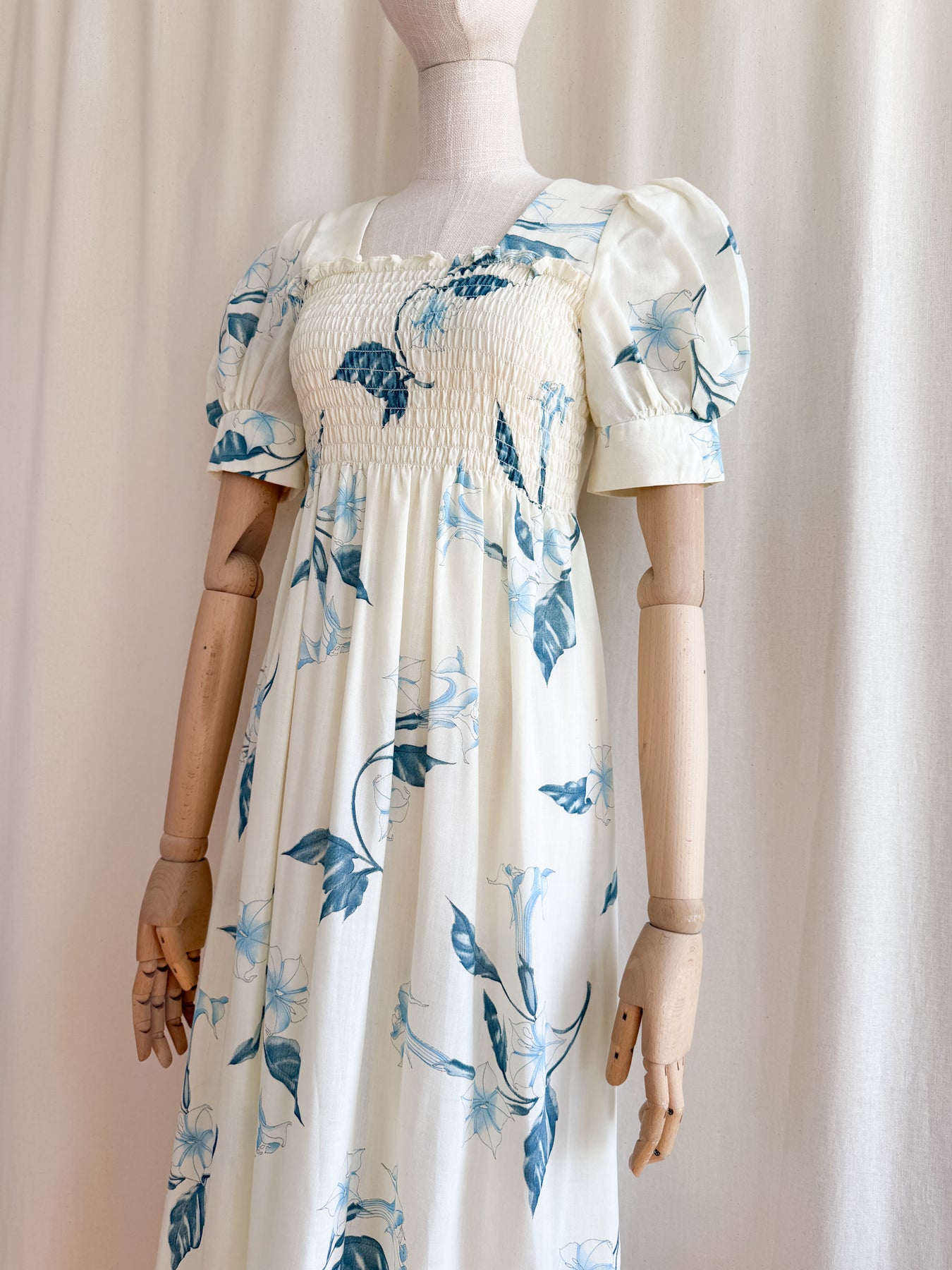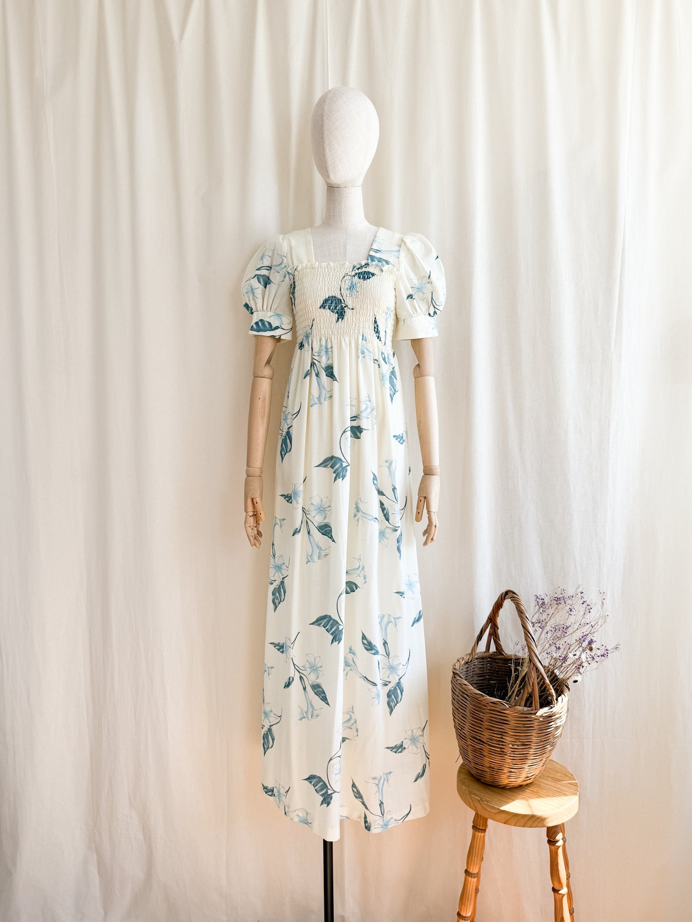 Meet Lily, she is an incredibly beautiful RARE precious 70s delicate ivory soft cotton shirred dream dress. This is one of those paired back easy to wear throw on vintage beauties, comfortable to wear and perfect for all occasions. She has puff sleeves, a shirred bodice and a flowing skirt and print is just divine..