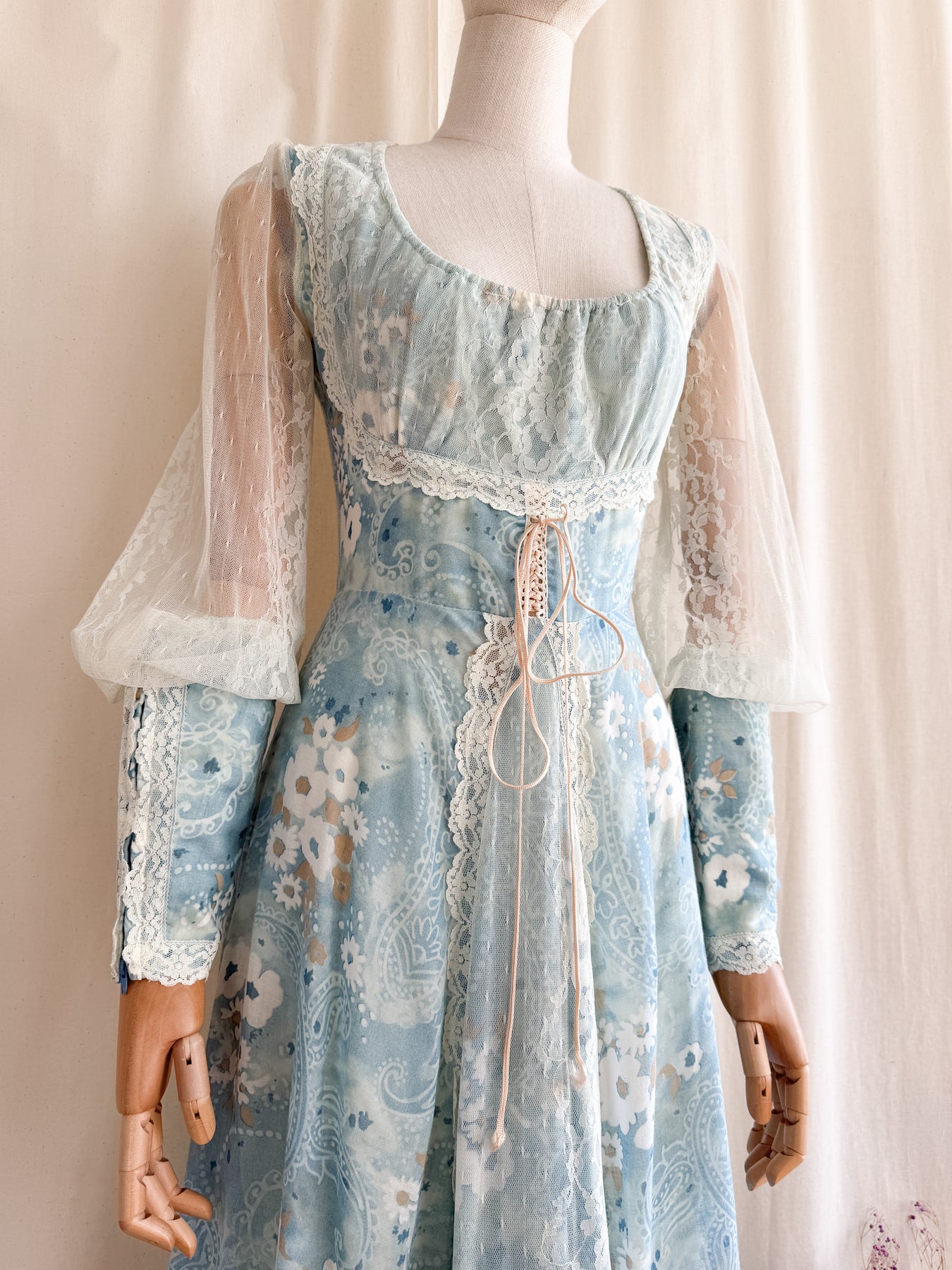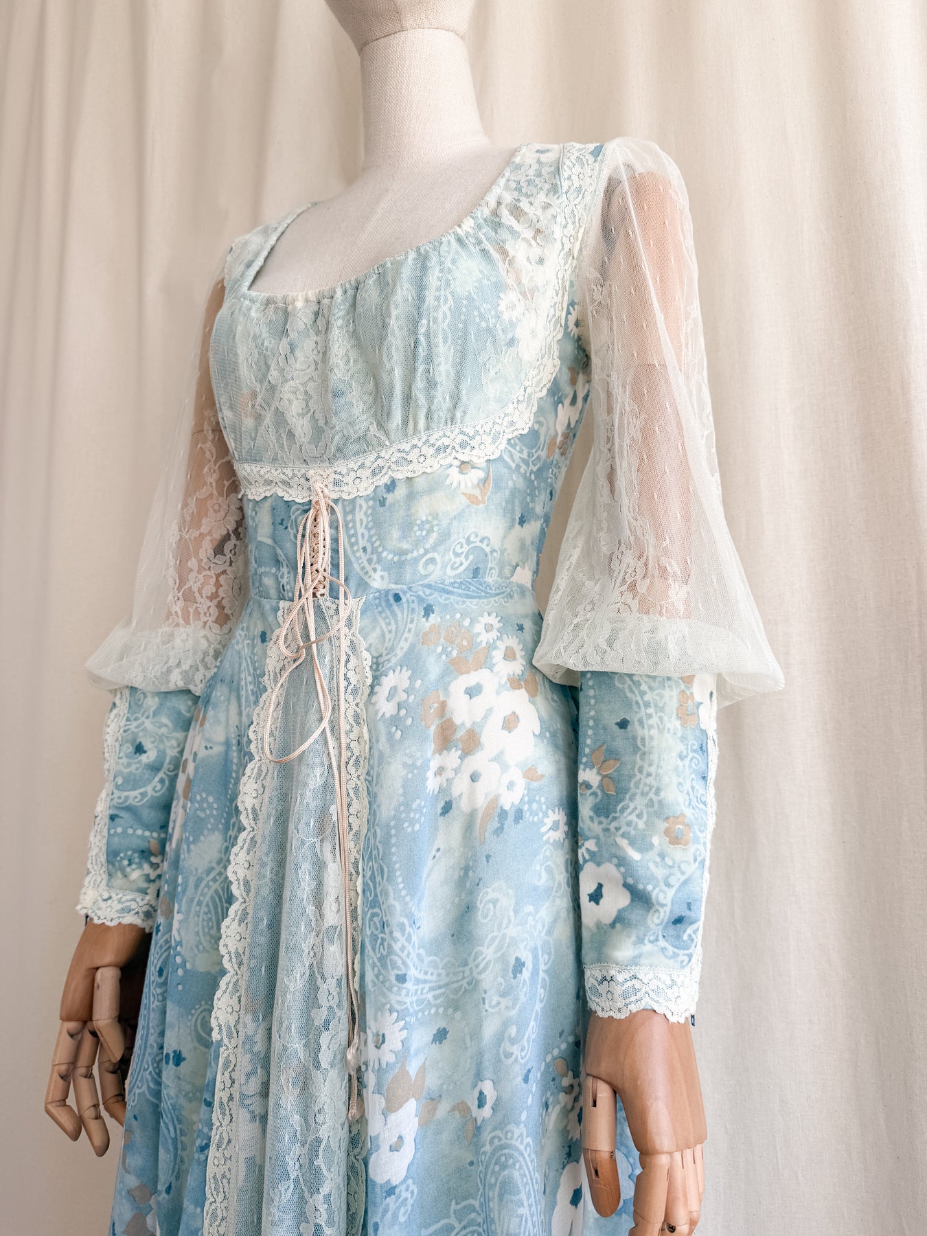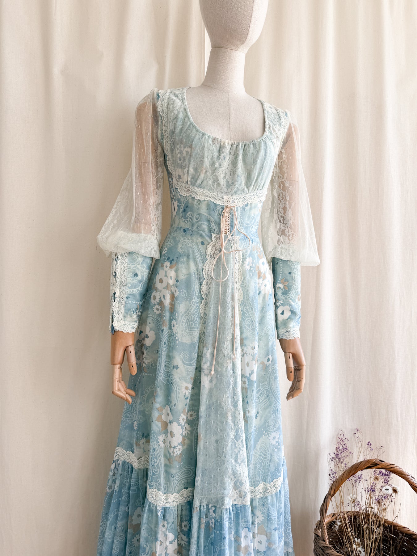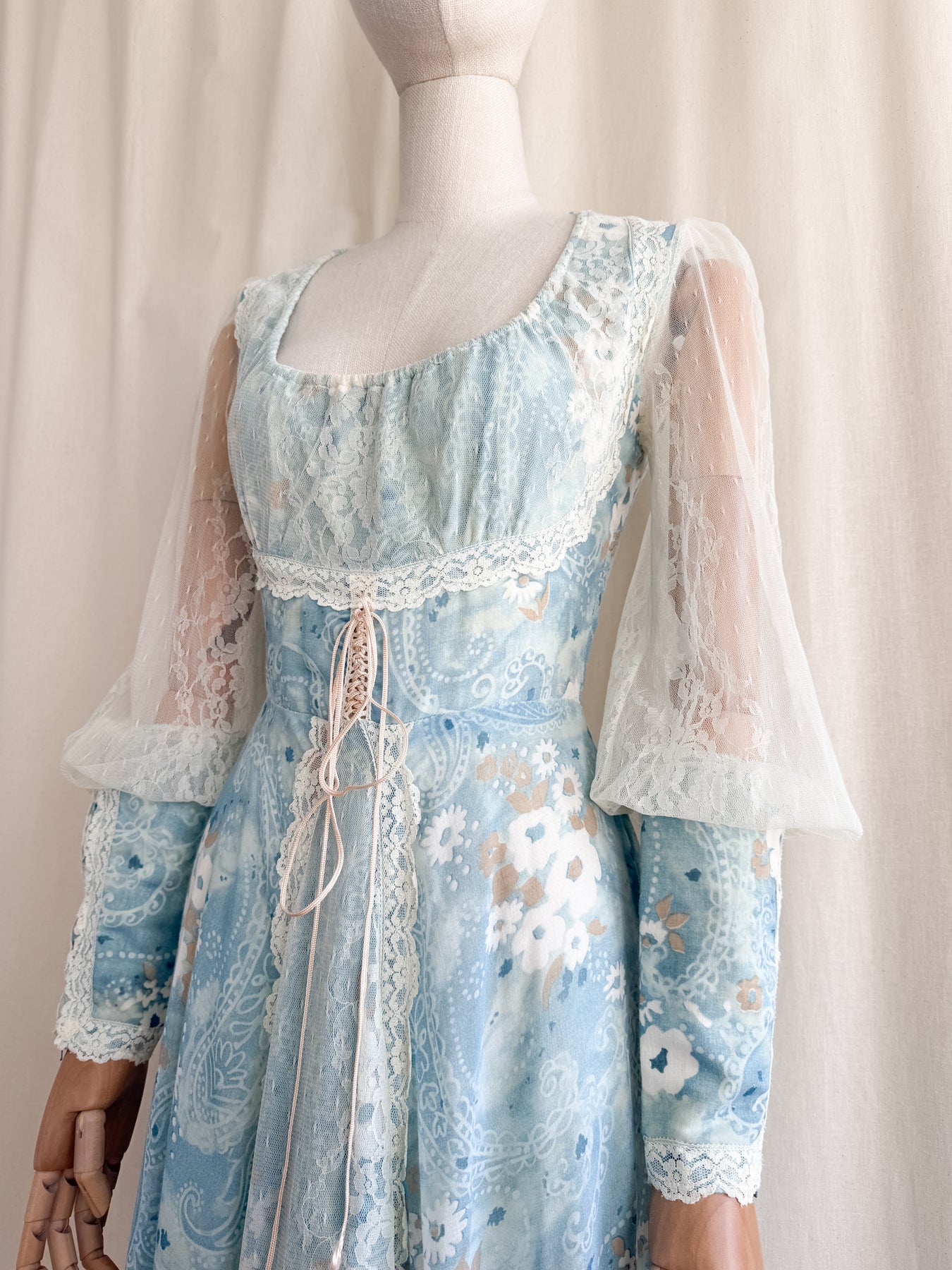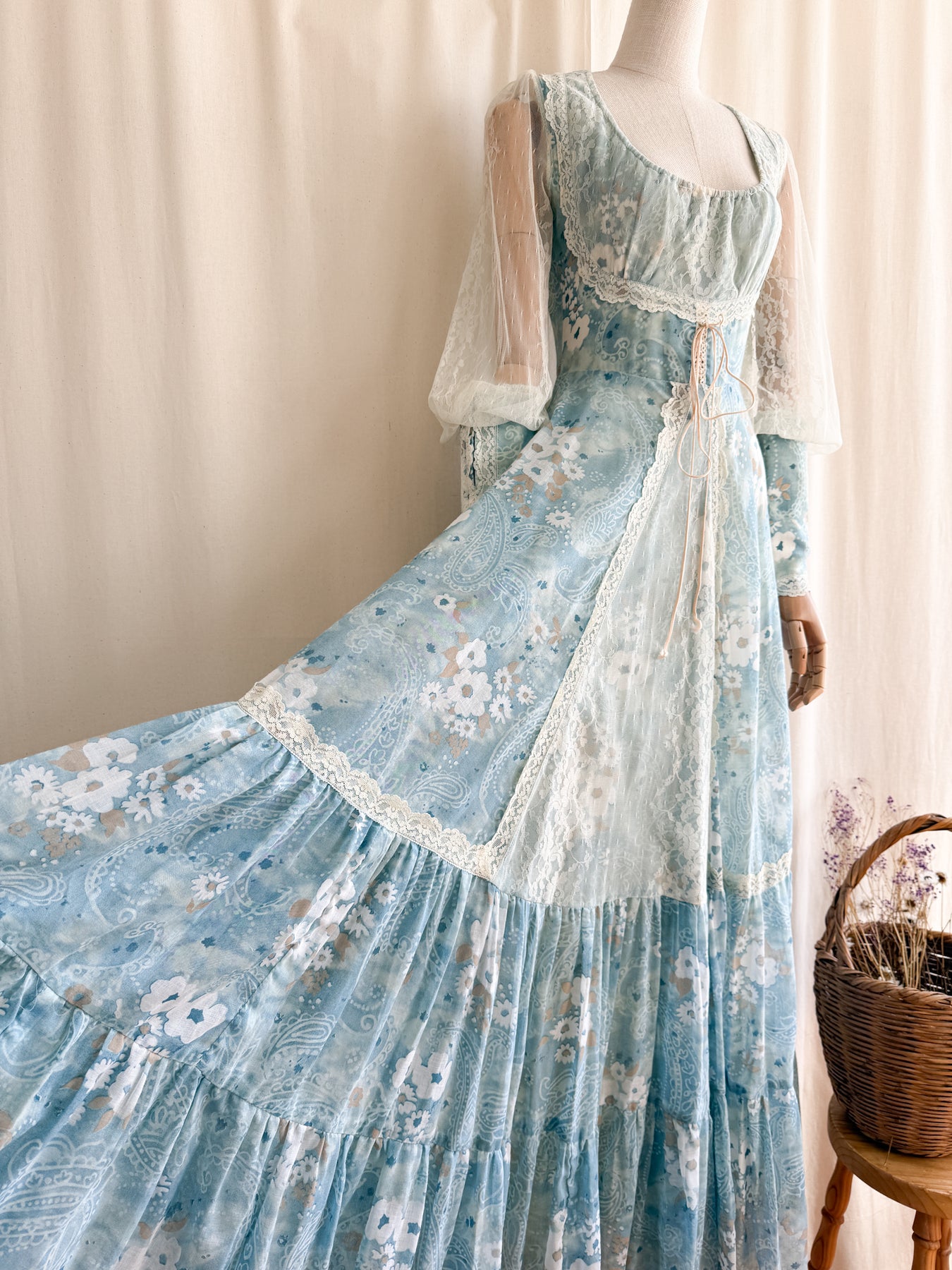 Meet River Princess, she is a STUNNING and HOLY GRAIL RARE highly collectible ethereal Gunne Sax dream dress named the 'River Princess Gunne', beautifully crafted in a delicate cotton in a beautiful soft blue shade with gorgeous floral print, she is also lined. This pretty has the most beautiful deep cuffed lace sleeves and delicate lace placements, and I absolutely adore the lace frill details. She has a gorgeous elasticated ruched neckline, corset feature to her waist, fitted bodice and huge flowing tiered skirt, and when worn flows like magic.. She is a true piece of vintage beauty and an absolute treasure to behold..