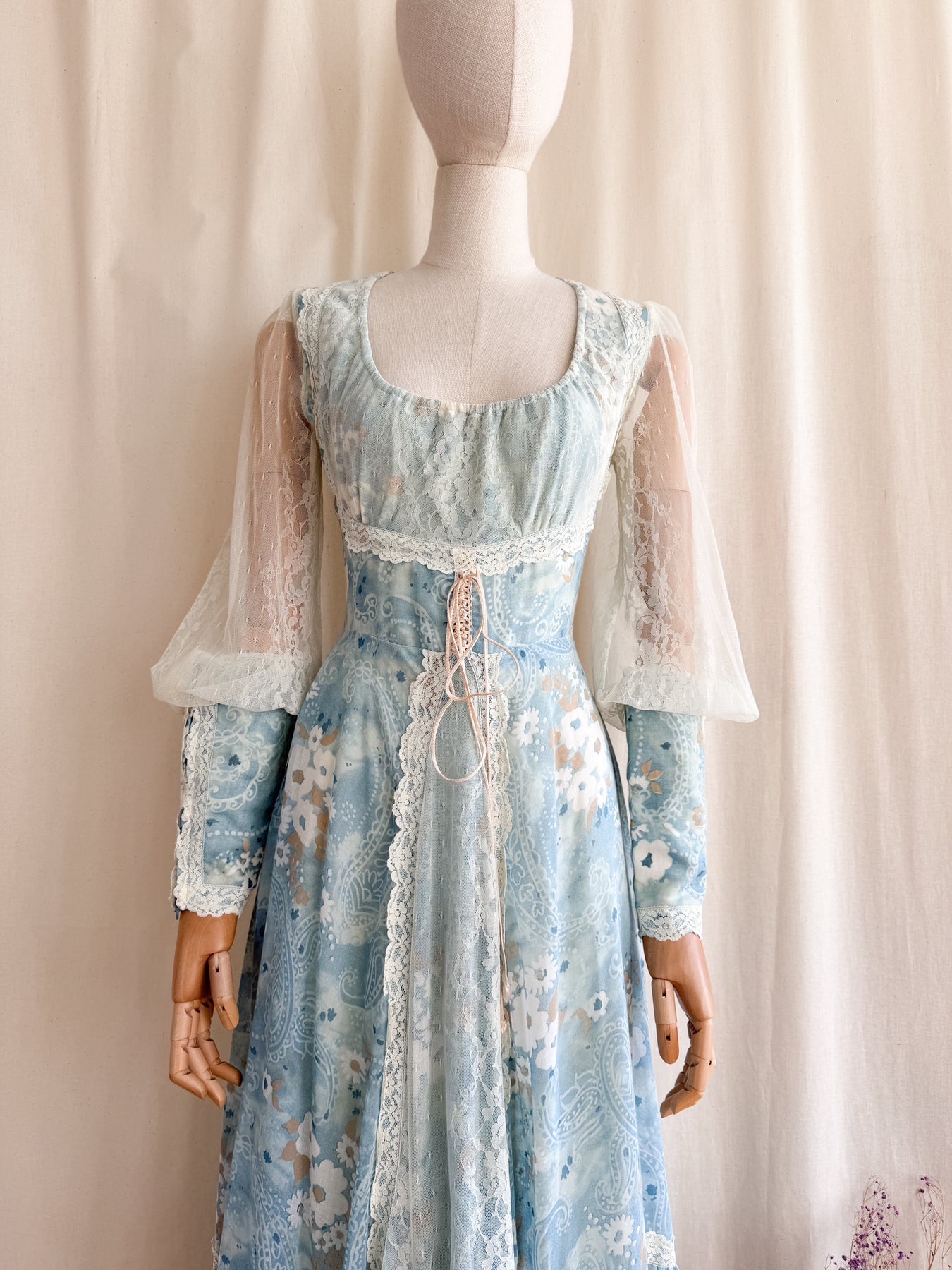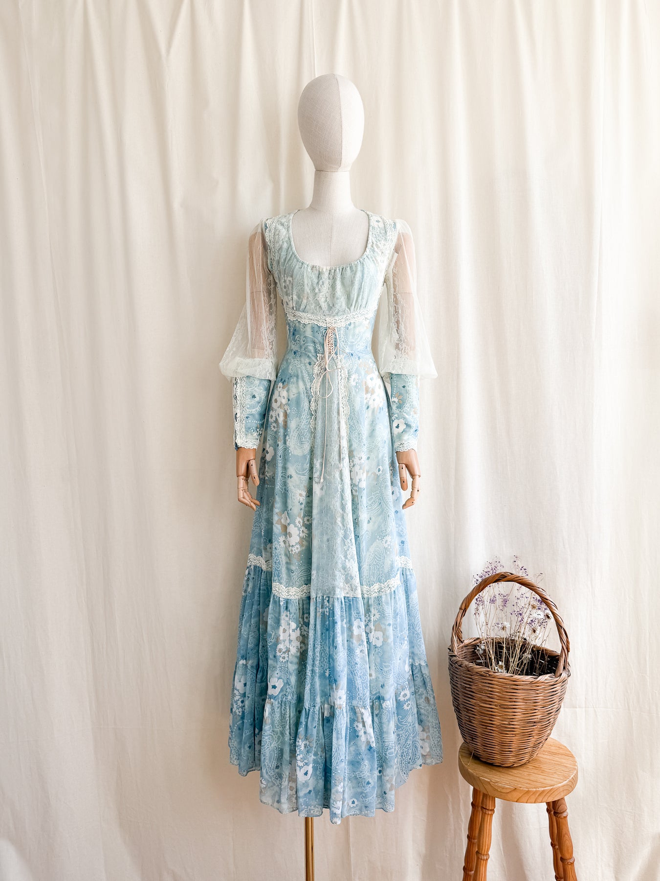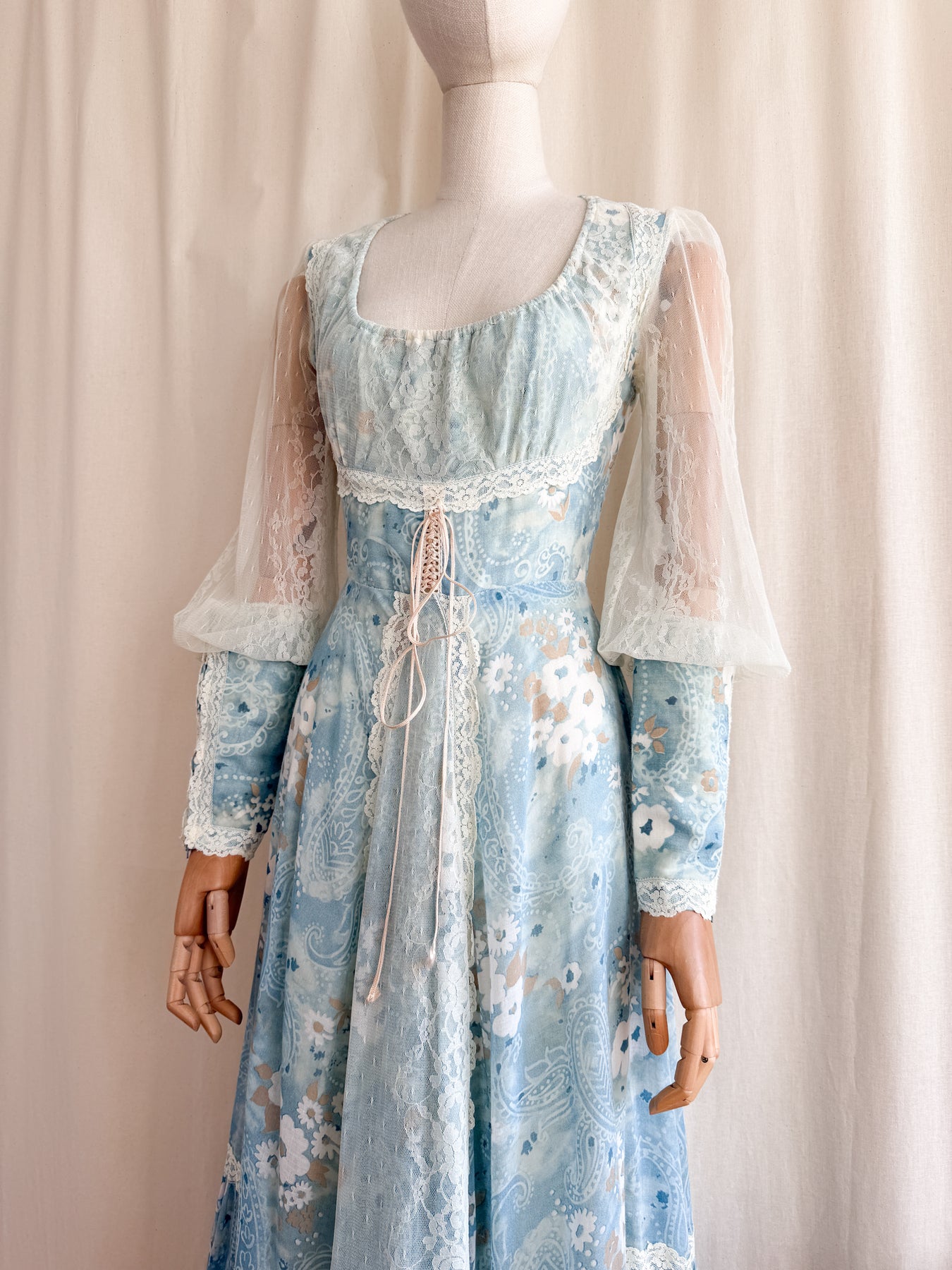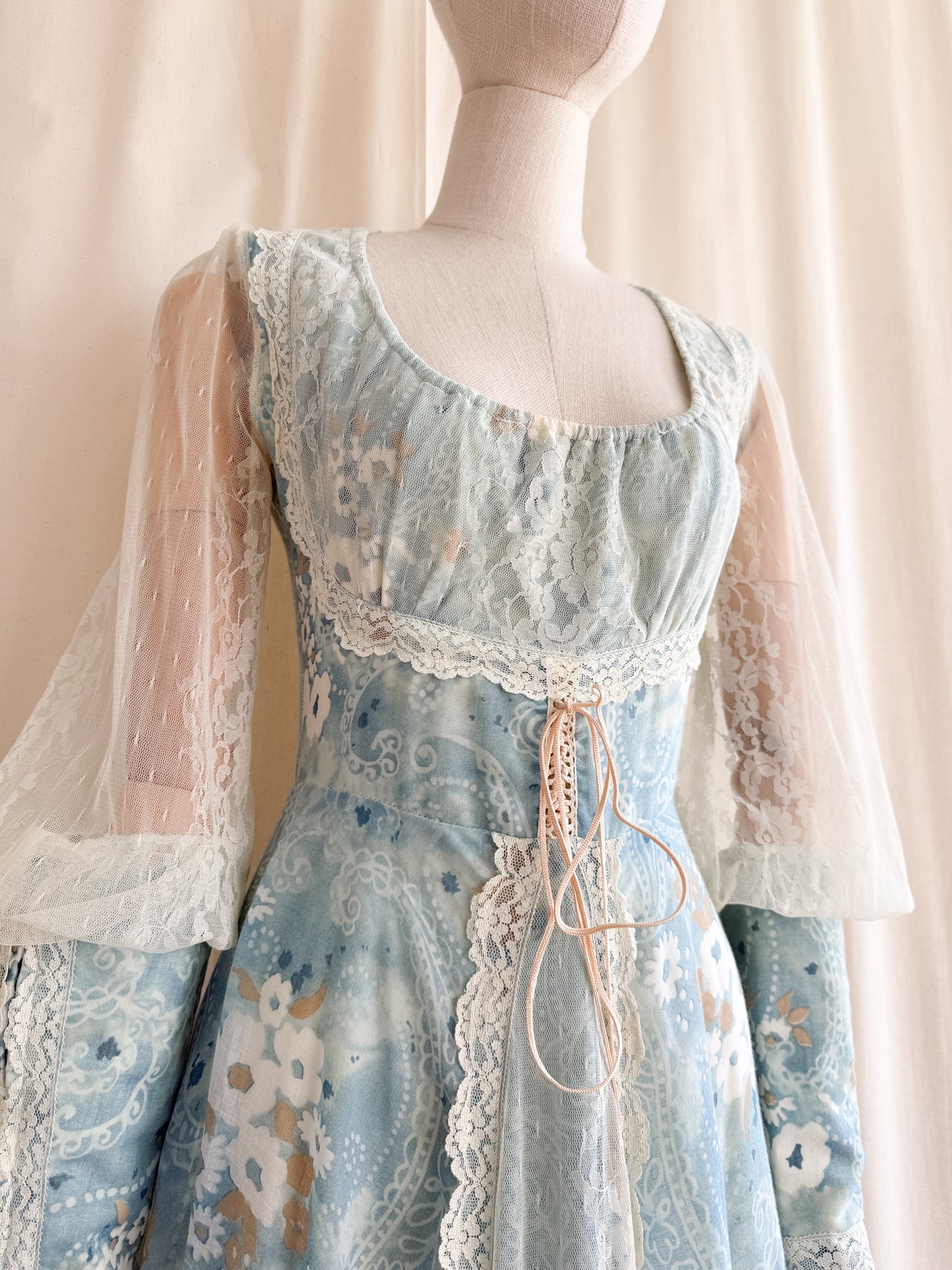 Meet River Princess, she is a STUNNING and HOLY GRAIL RARE highly collectible ethereal Gunne Sax dream dress named the 'River Princess Gunne', beautifully crafted in a delicate cotton in a beautiful soft blue shade with gorgeous floral print, she is also lined. This pretty has the most beautiful deep cuffed lace sleeves and delicate lace placements, and I absolutely adore the lace frill details. She has a gorgeous elasticated ruched neckline, corset feature to her waist, fitted bodice and huge flowing tiered skirt, and when worn flows like magic.. She is a true piece of vintage beauty and an absolute treasure to behold..