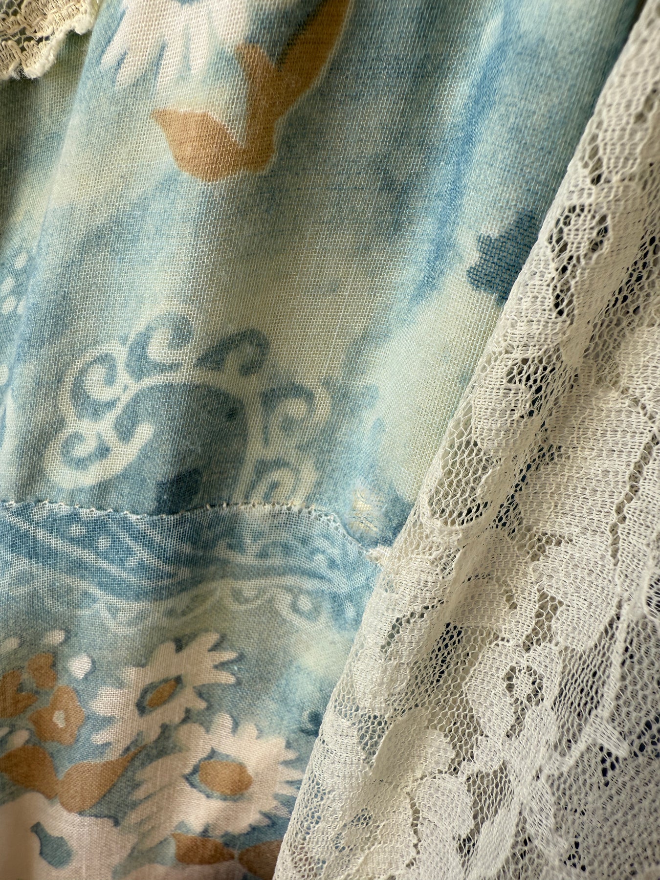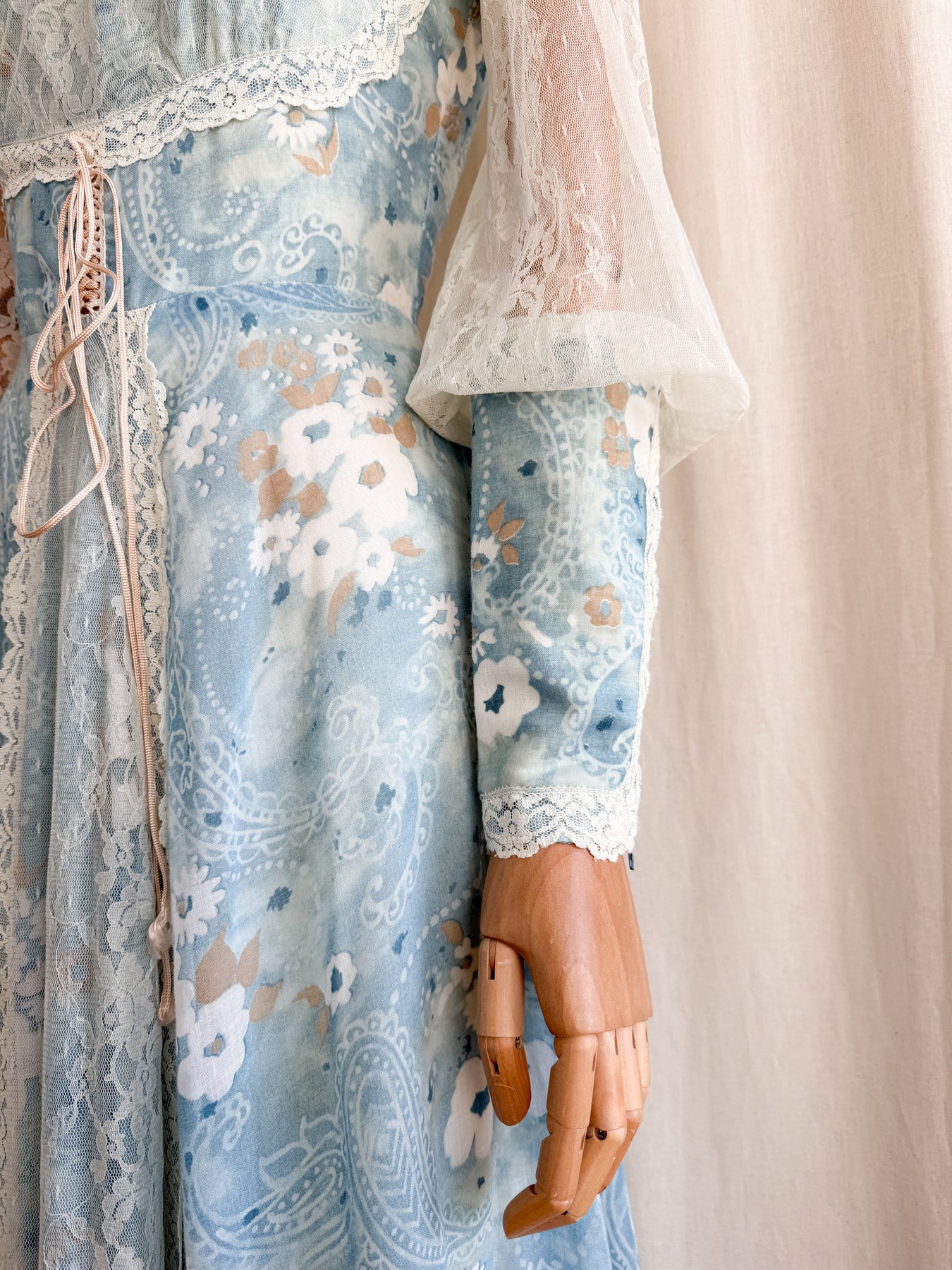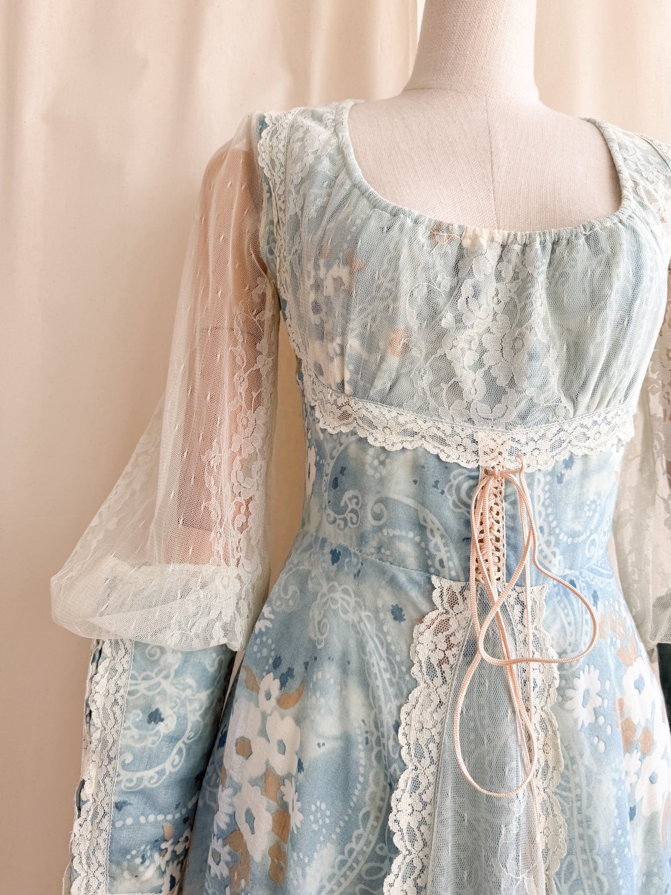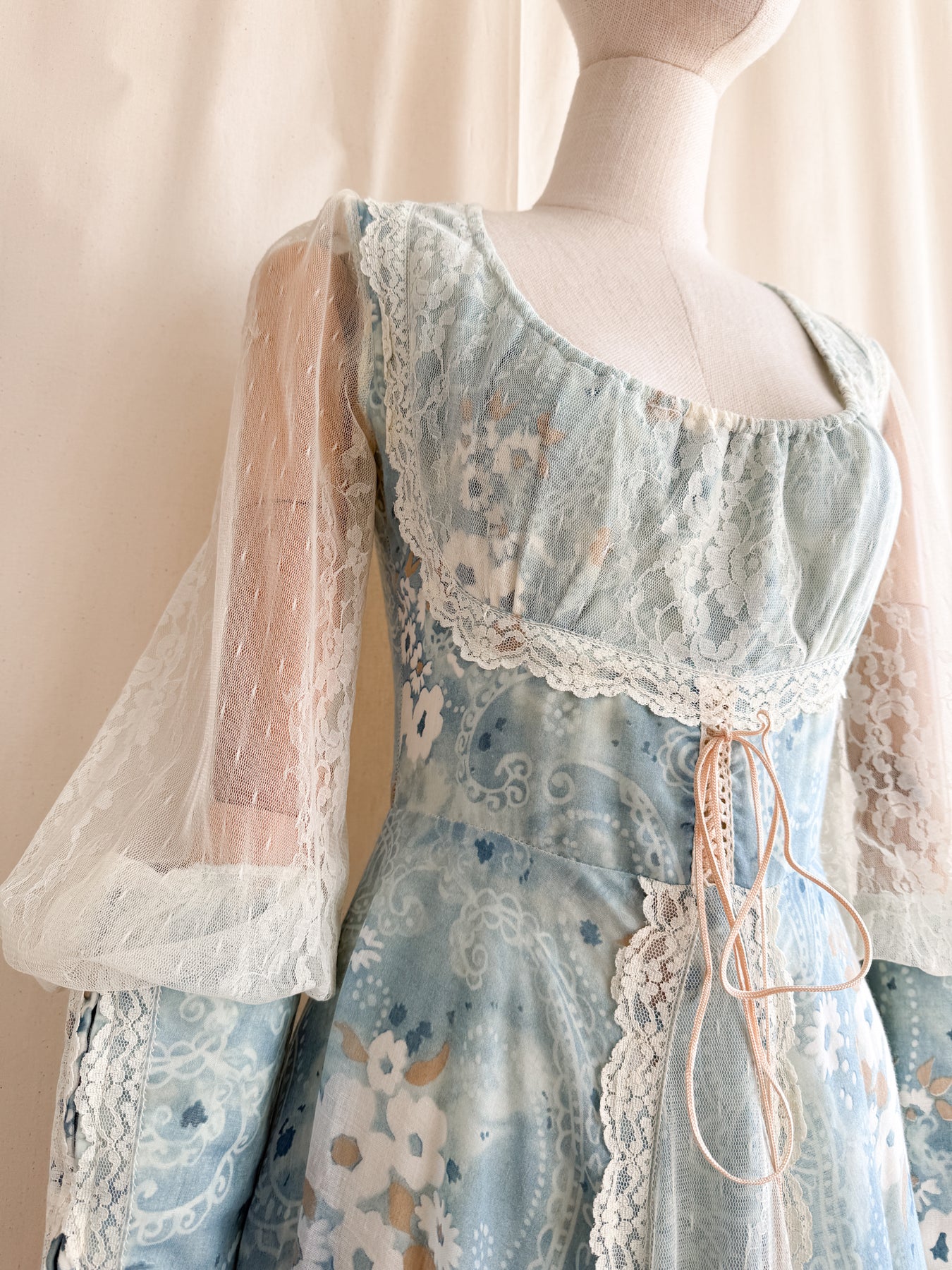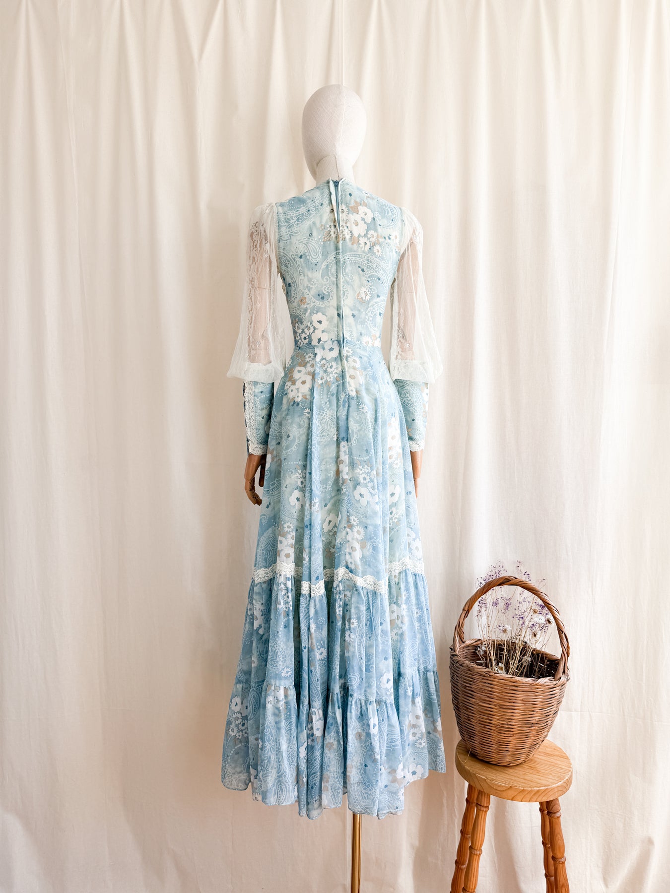 Meet River Princess, she is a STUNNING and HOLY GRAIL RARE highly collectible ethereal Gunne Sax dream dress named the 'River Princess Gunne', beautifully crafted in a delicate cotton in a beautiful soft blue shade with gorgeous floral print, she is also lined. This pretty has the most beautiful deep cuffed lace sleeves and delicate lace placements, and I absolutely adore the lace frill details. She has a gorgeous elasticated ruched neckline, corset feature to her waist, fitted bodice and huge flowing tiered skirt, and when worn flows like magic.. She is a true piece of vintage beauty and an absolute treasure to behold..