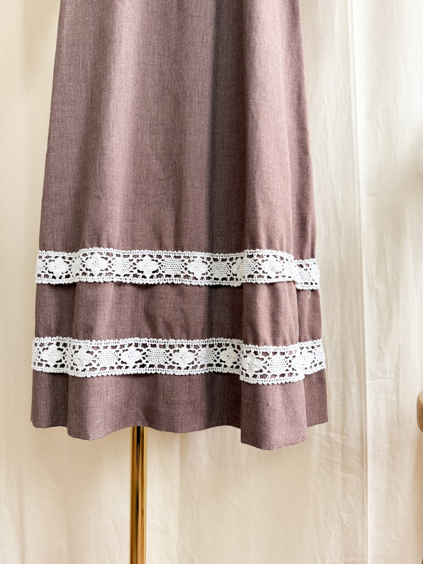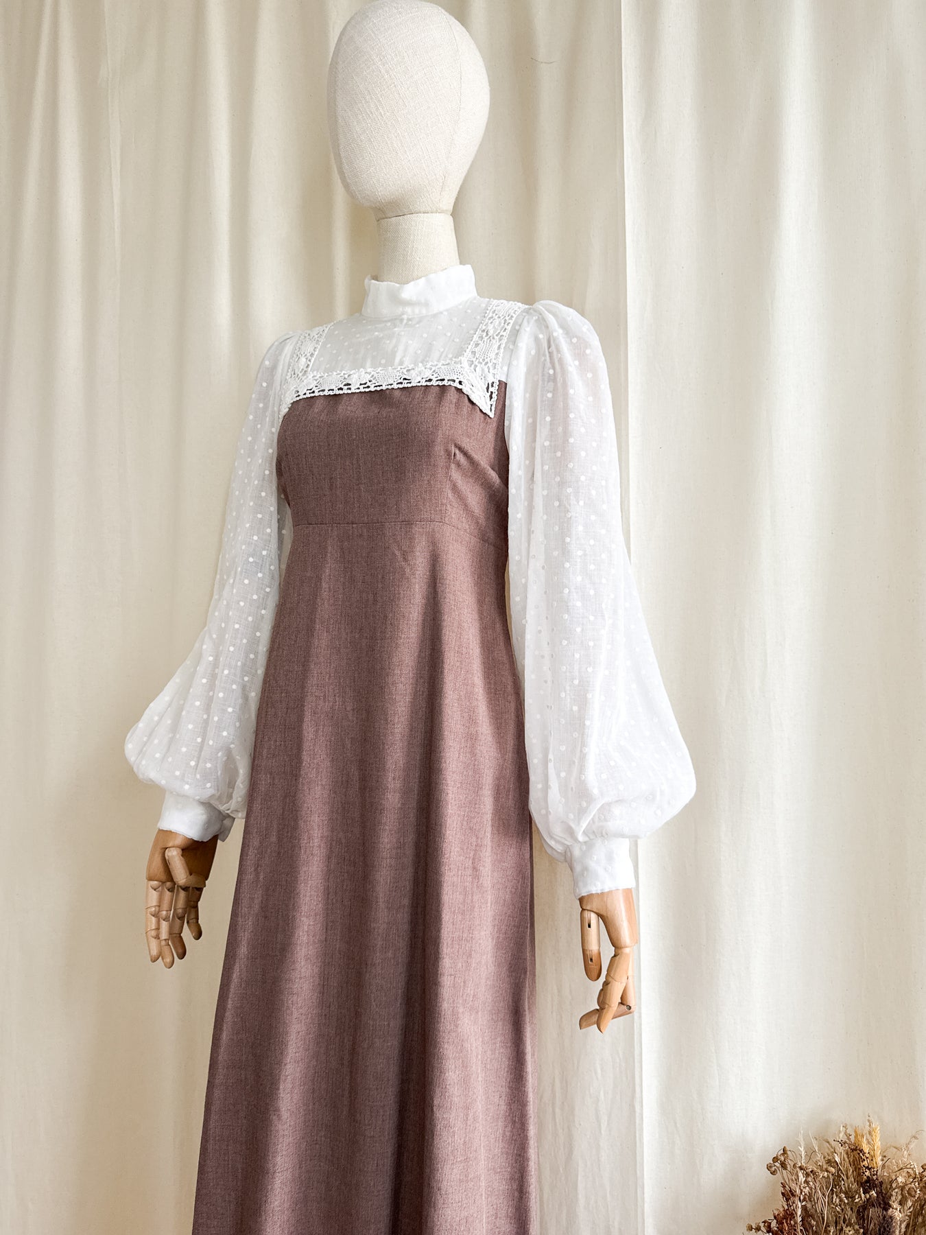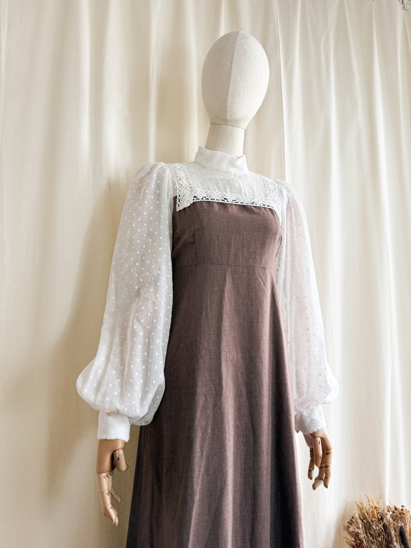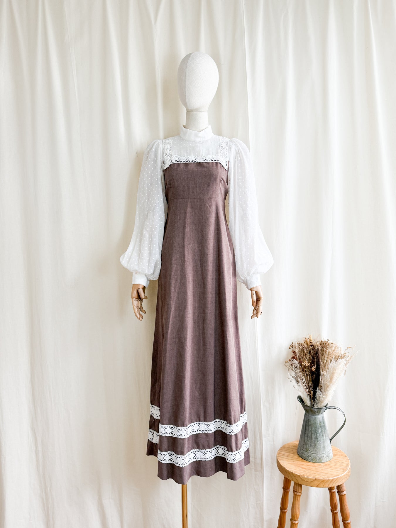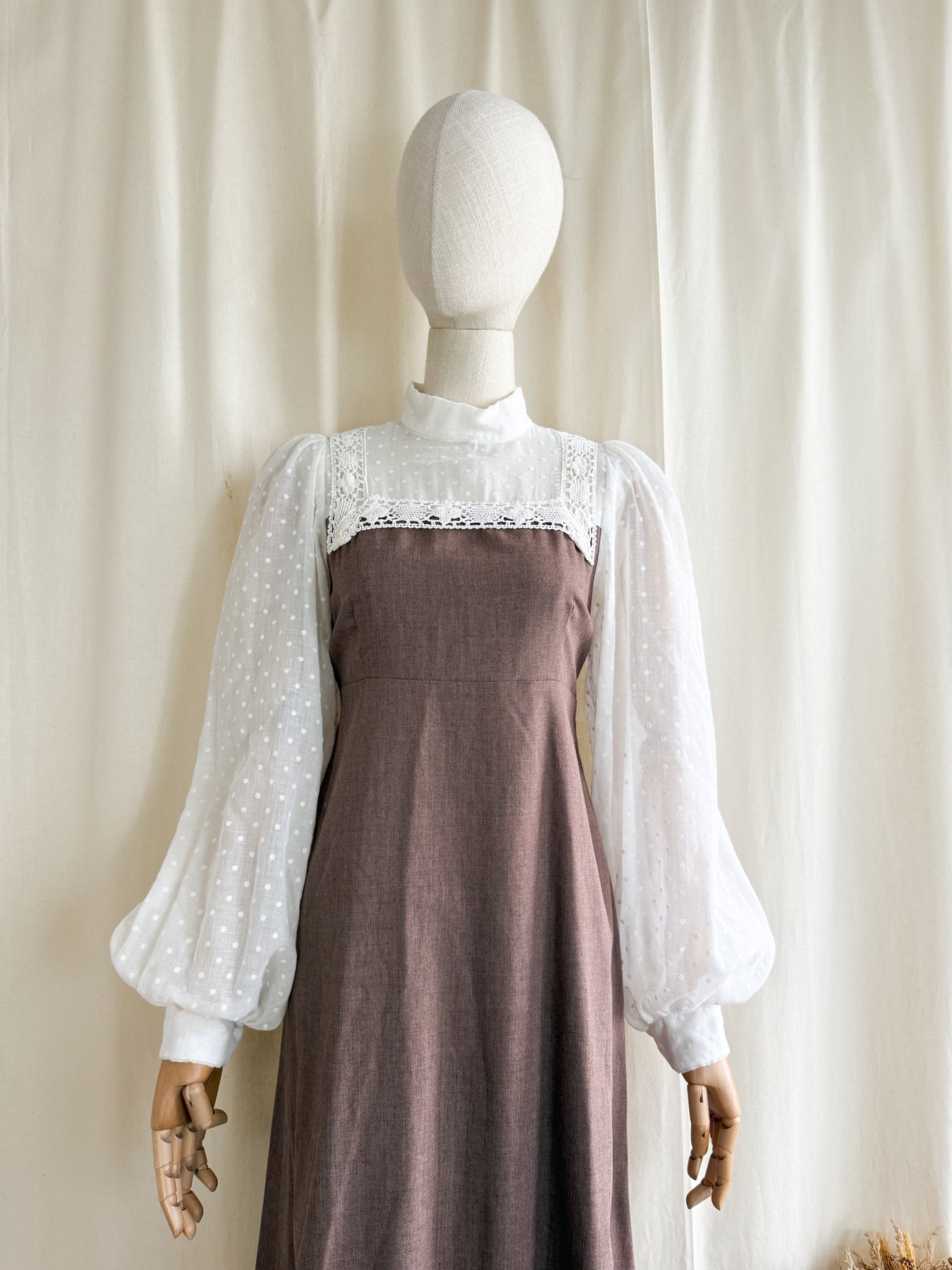 This rare 1970s Marion Donaldson cotton maxi dress combines a thick brown cotton body with delicate dobby spot white cotton sleeves, accented by intricate cotton crochet lace trims. Her historical-inspired silhouette and billowing sleeves evoke true vintage magic that is forever beautiful. She is perfect for styling with boots all season round..
